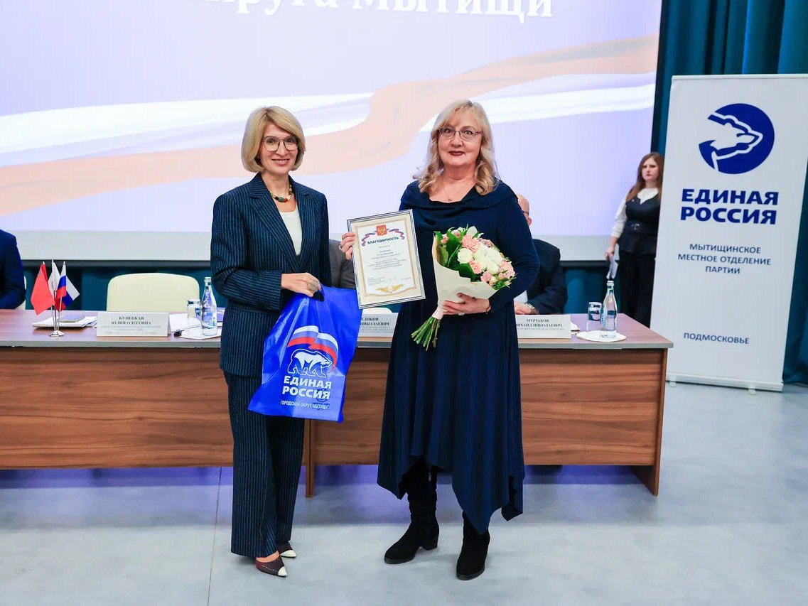 В честь праздника — 24-летия партии «Единая Россия» — Секретарь местного отделения партии, Глава городского округа Мытищи Юлия Купецкая вручила благодарность одному из старейших и уважаемых секретарей партии — Завориной Елене Ивановне, секретарю первичного отделения №7