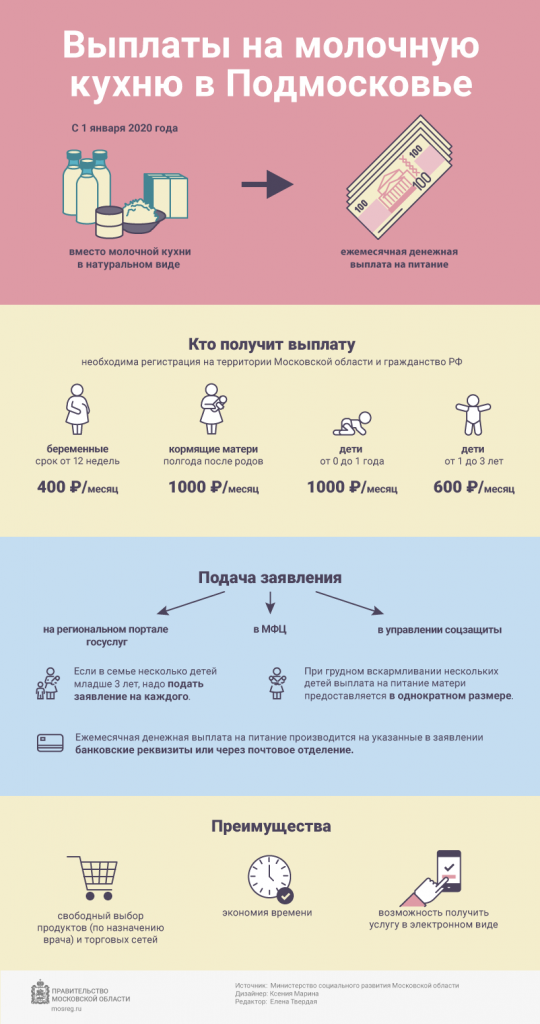 Услуга по обеспечению питанием беременных женщин, кормящих матерей и детей в возрасте до трех лет, которую называют «молочной кухней», – это мера государственной социальной поддержки семей с маленькими детьми. С 1 февраля 2019 года региональное министерство здравоохранения запустило электронную услугу по обеспечению детским питанием в Московской области в режиме онлайн. Услуга предоставляется бесплатно - гражданам РФ, иностранным гражданам и лицам без гражданства, в том числе беженцам, зарегистрированным на территории Московской области и стоящим на учете по месту жительства в учреждениях здравоохранения Московской области. Отправить заявку на получение детского питания можно, оформив электронное заявление на портале государственных и муниципальных услуг Московской области.