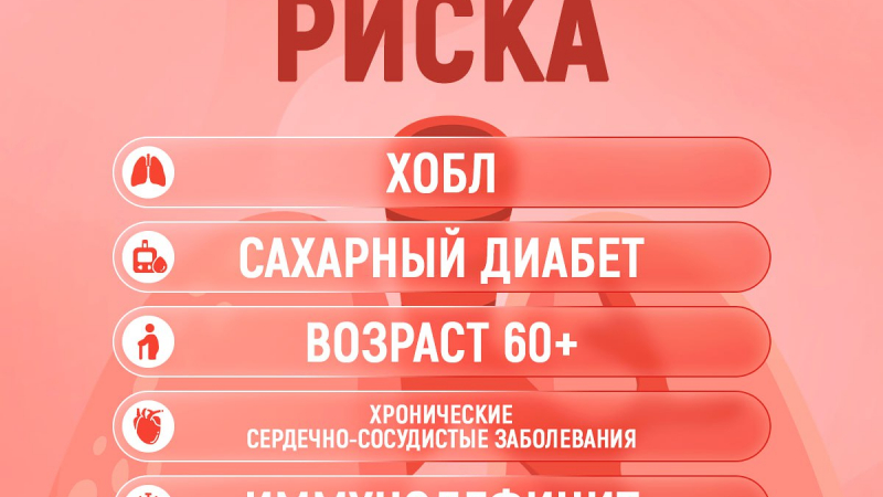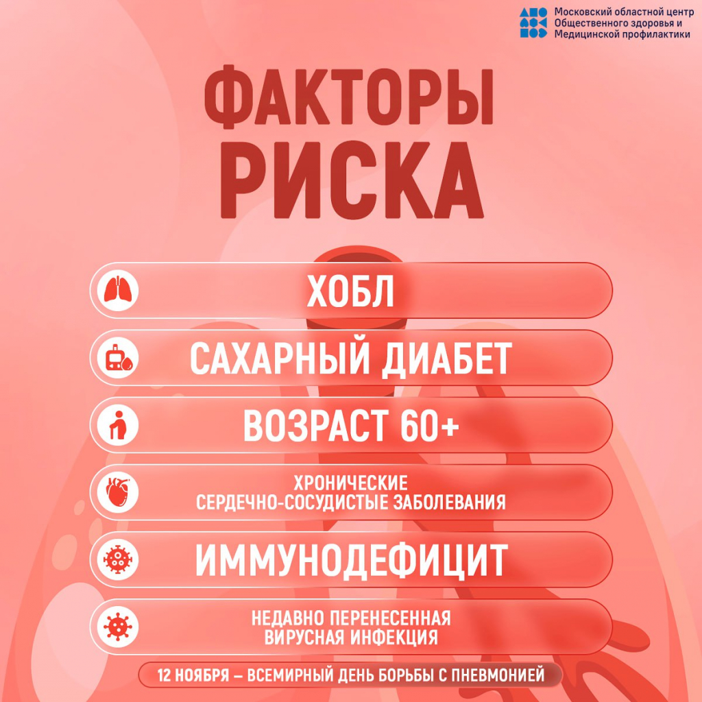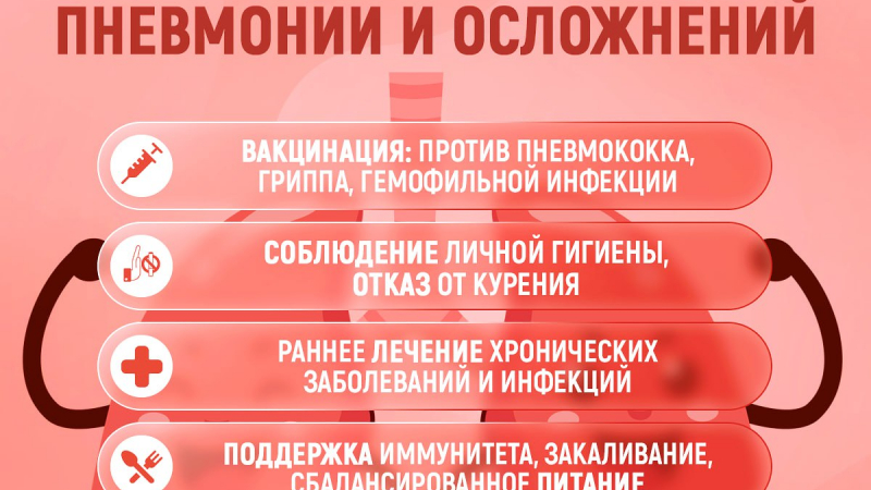 Часто пневмония развивается как осложнение после гриппа и ОРВИ. Одна из причин - снижение иммунитета: в нормальном состоянии организм способен справиться с большинством возбудителей. Риск пневмонии помогают снизить прививки против пневмококковой инфекции и гриппа особенно у людей из группы риска – к этой категории относятся люди старше 65 лет, а также страдающие эндокринными расстройствами, онкологическими заболеваниями, болезнями бронхолёгочной системы, печени и почек.