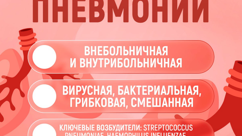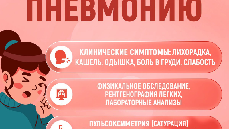 Пневмония — это острое воспаление легочной ткани. Его провоцирует инфекция, которая поражает альвеолы (воздушные мешочки) в одном или обоих легких. При пневмонии альвеолы заполняются патологической жидкостью, это делает дыхание болезненным и ограничивает поступление кислорода. Основные симптомы - повышение температуры, одышка, сухой или влажный кашель, болевые ощущения в области груди, усиливающиеся при глубоком вдохе, общая слабость, головная боль. Объективных экспресс-тестов на пневмонию не существует: диагноз ставит врач по клиническим проявлениям, а также по изменениям на рентгенограмме: это «золотой стандарт» диагностики заболевания. Поэтому чрезвычайно важно вовремя обратиться за медицинской помощью, не занимаясь самолечением.