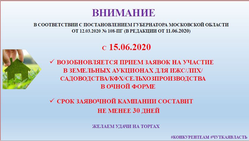 (12+) Внимание! С 15.06 возобновляется прием заявок на участие в земельных аукционах для ИЖС/ЛПХ/садоводства/КФХ/сельхозпроизводства в очной форме. Срок заявочной кампании составит не менее 30 дней.