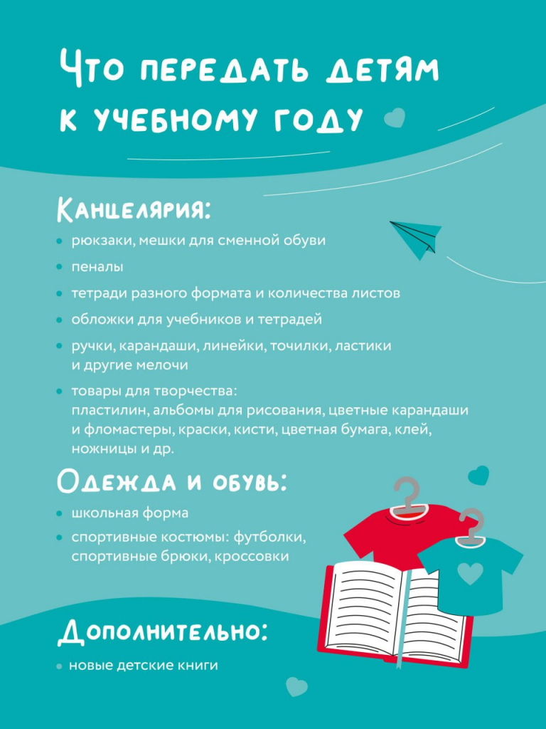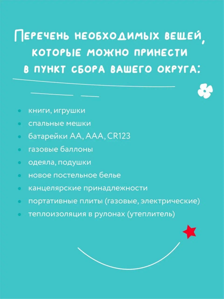 До 17 августа жители могут принести как предметы первой необходимости для военнослужащих (болеутоляющие, бинты, генераторы, дроны, питьевую воду и т. д.), так и школьные принадлежности для детей (тетради, ручки, рюкзаки и др)