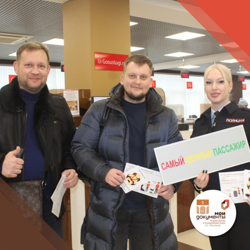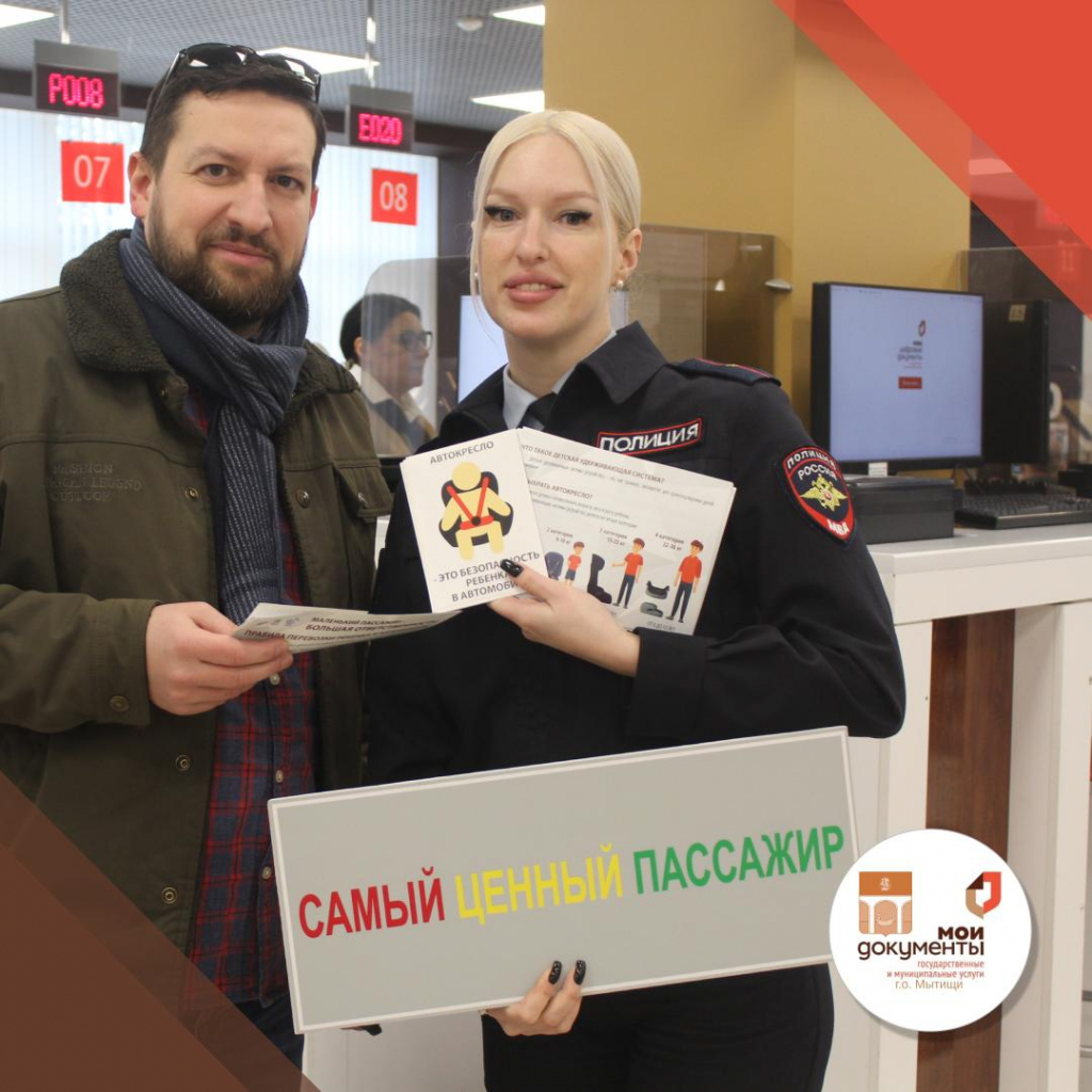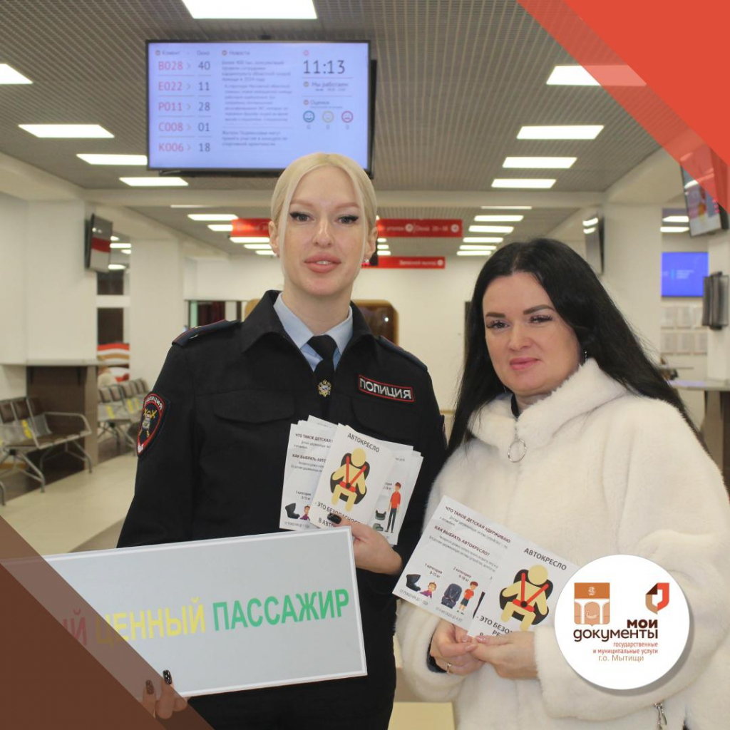 Сотрудники Госавтоинспекции в рамках социального раунда «Маленький пассажир – большая ответственность» провели профилактическую акцию и напомнили посетителям МФЦ Мытищ о правилах перевозки детей.