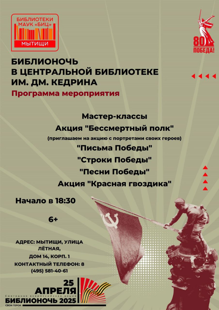 Центральная библиотека имени Д. Кедрина приглашает на Библионочь-2025, в программе которой – различные мастер-классы, а также акция «Бессмертный полк». Приходите в библиотеку 25 апреля в 18.30 с портретами своих героев.