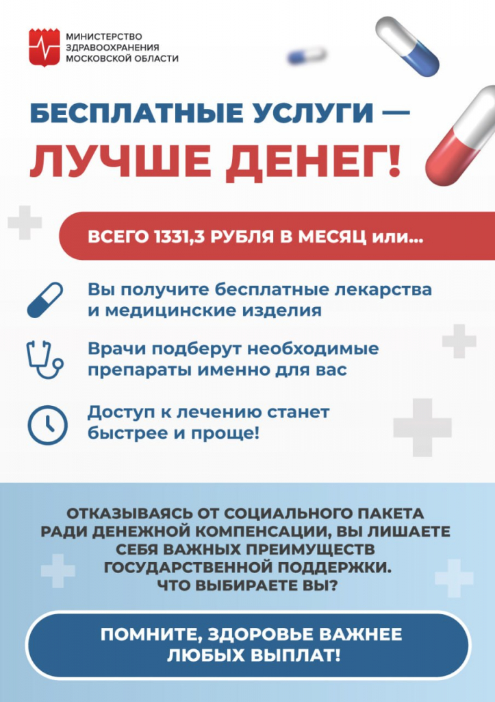 В этом году доля жителей Подмосковья, который выбирают набор социальных услуг вместо компенсации, увеличилась на 2%. Помните, здоровье важнее любых выплат!