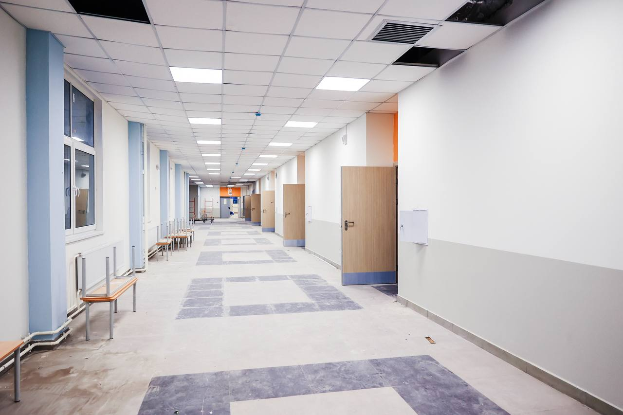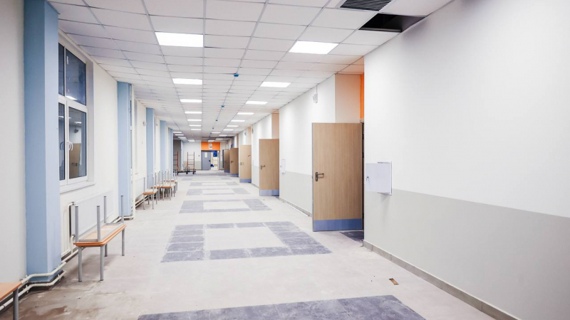 Основные строительные работы в новом образовательном учреждении завершены. В здании расстанавливается мебель, подключается оборудование в пищеблоке. Также проводится клининг внутренних помещений, уборка и вывоз мусора.