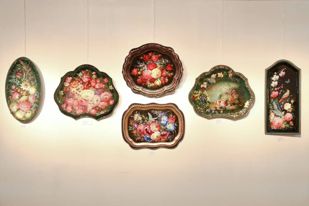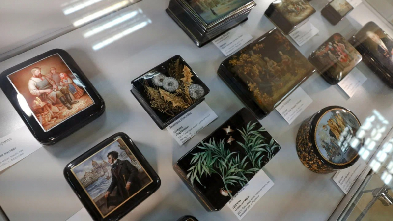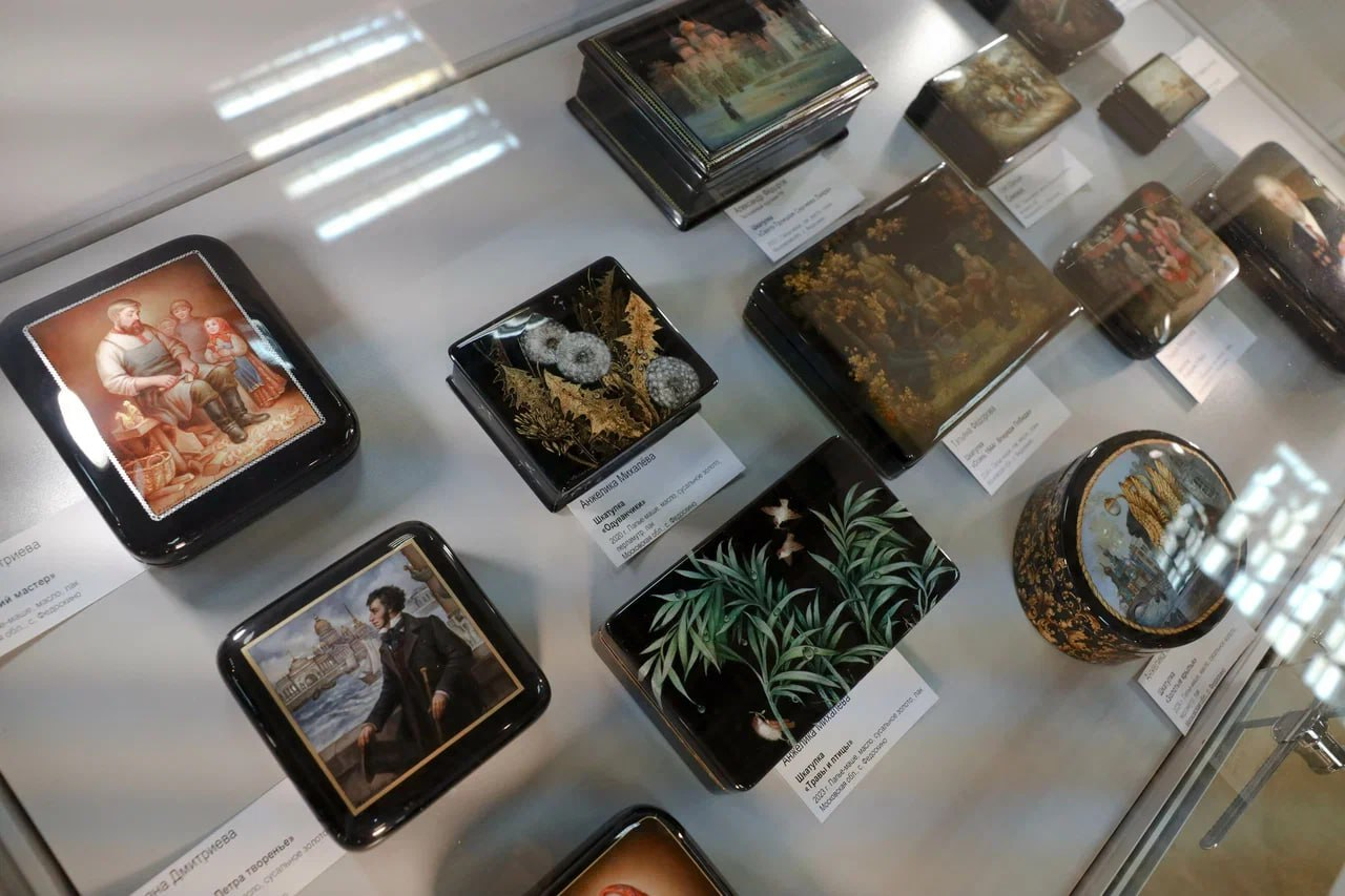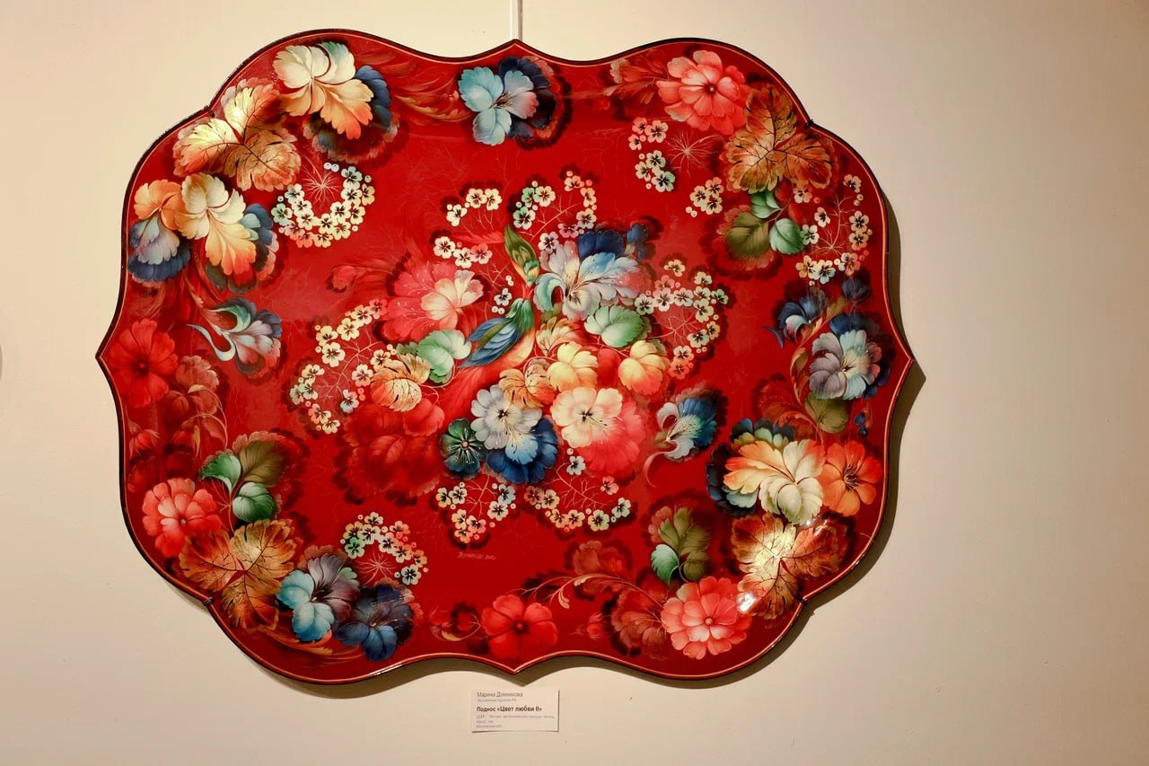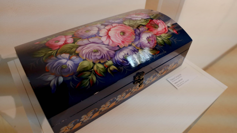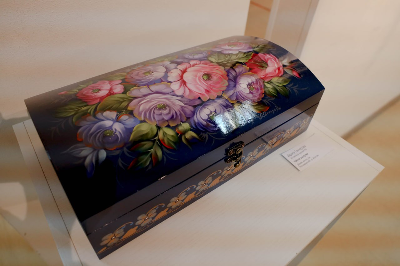 В экспозиции было представлено большое разнообразие традиционных промыслов: Федоскинская лаковая миниатюра, Жостовская фабрика, Богородская резьба, Хохломская и Полховско-майданской росписи, Мстерская миниатюра и многие другие.