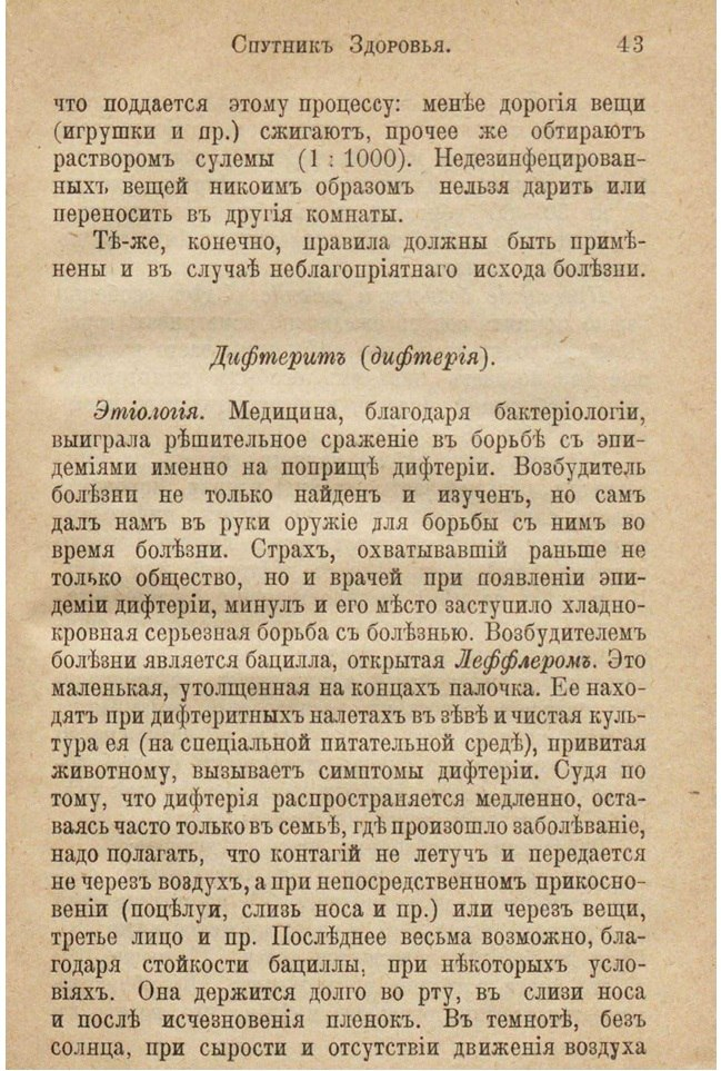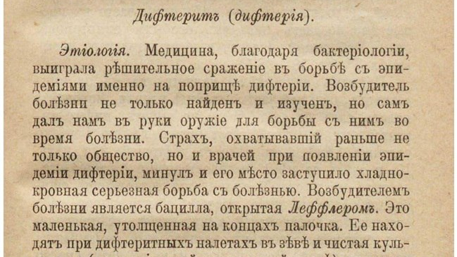 «В прежние времена дифтерия причислялась к самым неблагоприятным детским болезням, давая смертность до 50–60 %, а в первые месяцы жизни – до 70–100 %. Теперь же возбудитель дифтерии не только найден и изучен, но и сам дал нам в руки оружие для борьбы с ним во время болезни. Медицина, благодаря бактериологии, выиграла решительное сражение в борьбе с эпидемиями именно на поприще дифтерии. Страх, охватывающий раньше не только общество, но и врачей при появлении эпидемии дифтерии, минул, и на его место заступила хладнокровная серьезная борьба с болезнью» – писали в журнале «Домашний врач» № 3 1901 года.