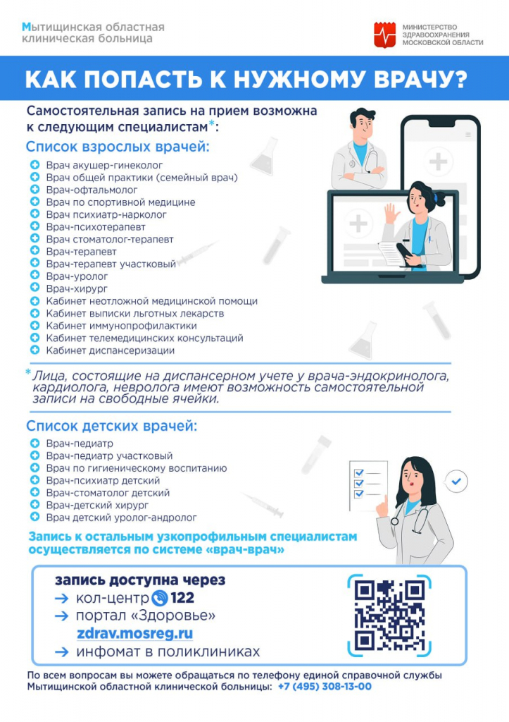 Жители Мытищ могут воспользоваться онлайн-сервисами раздела «Здоровье». Записаться на прием к врачу, оформить вызов врача на дом, получить информацию о медицинских учреждениях можно на данном ресурсе https://zdrav.mosreg.ru/start. Важно! Чтобы пользоваться личным кабинетом на данном портале необходимо актуализировать данные, в том числе полиса ОМС, в личном кабинете на портале Госуслуг https://uslugi.mosreg.ru.