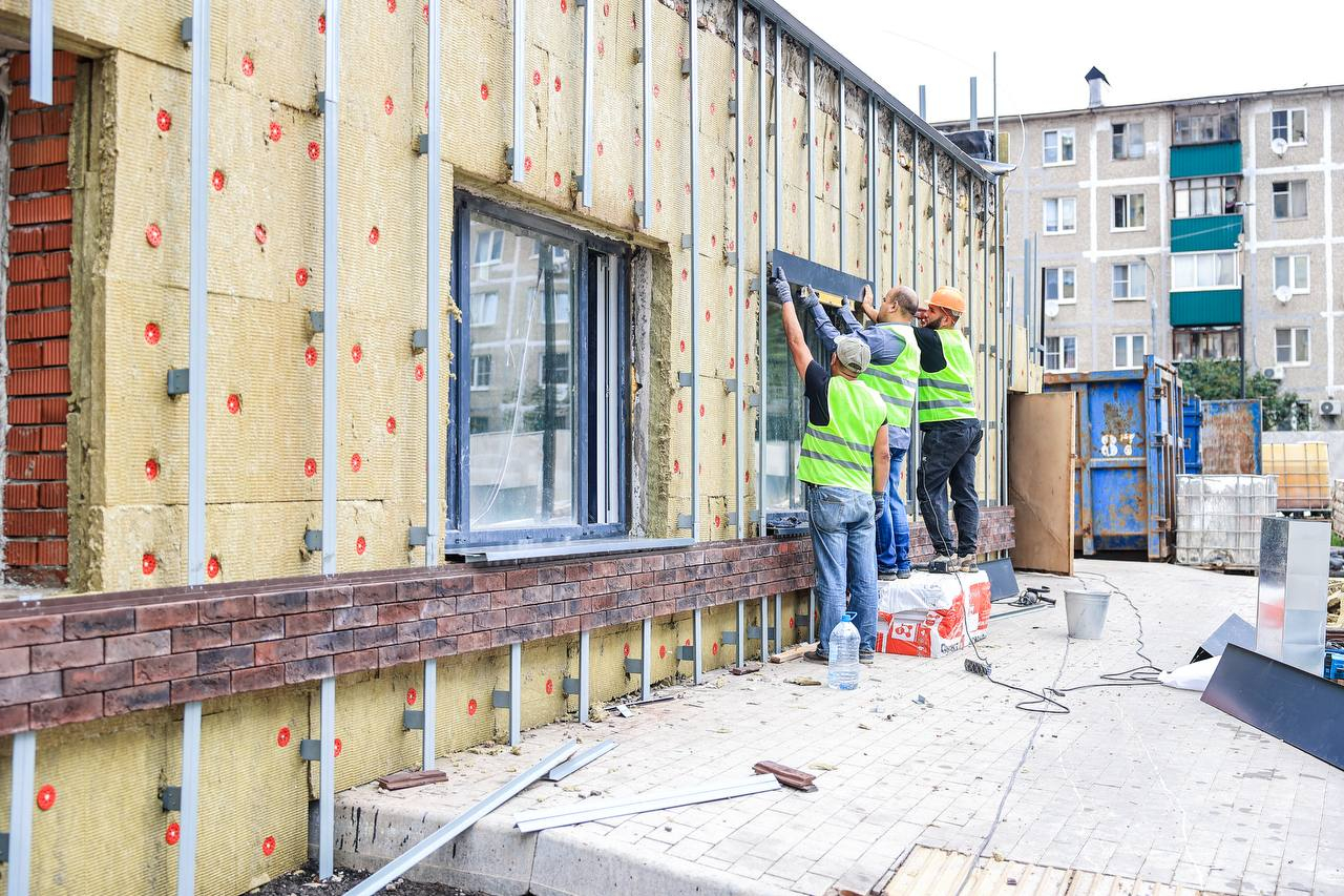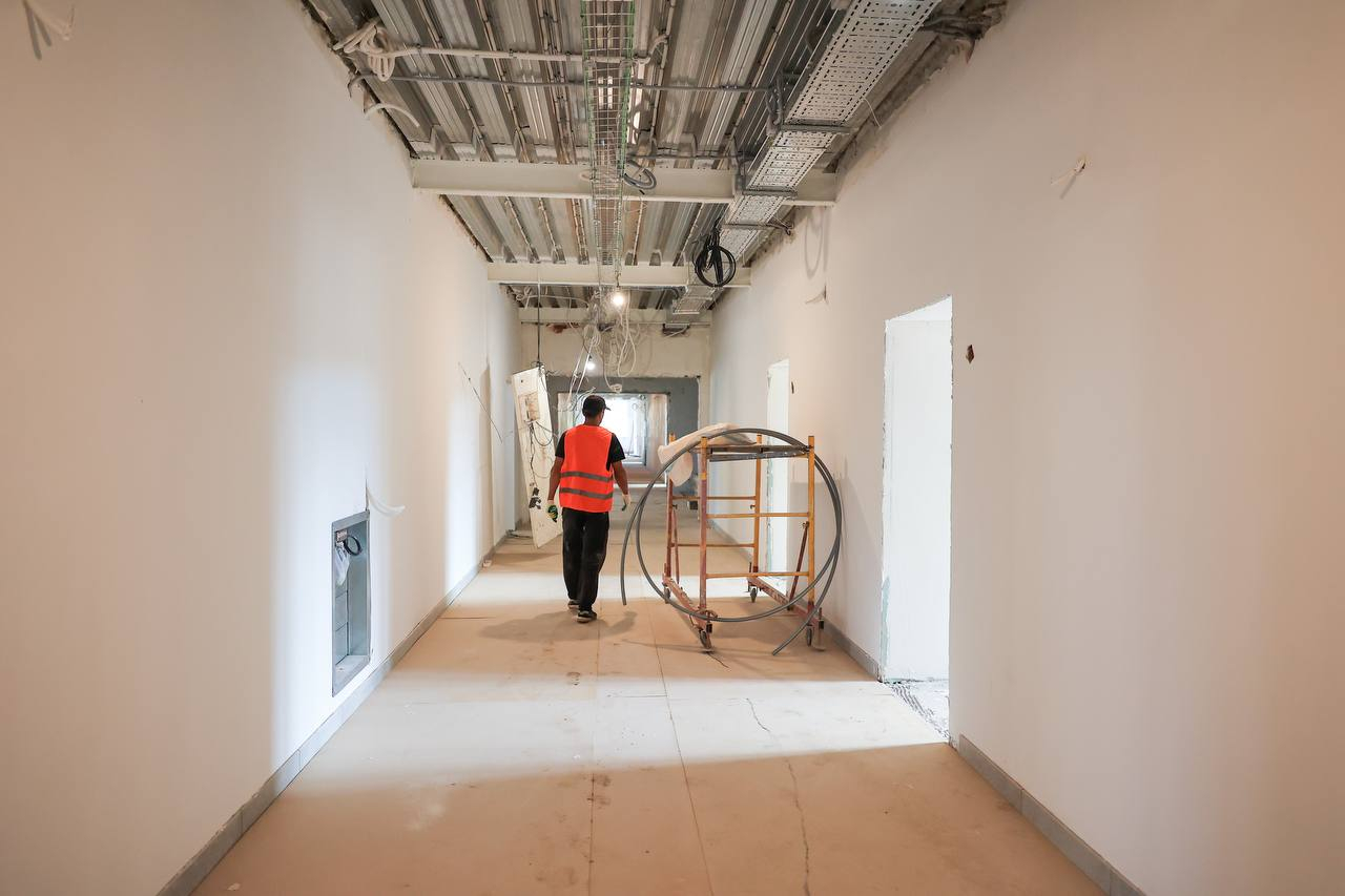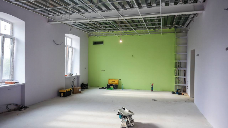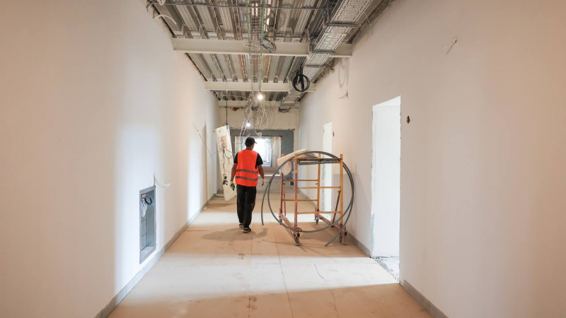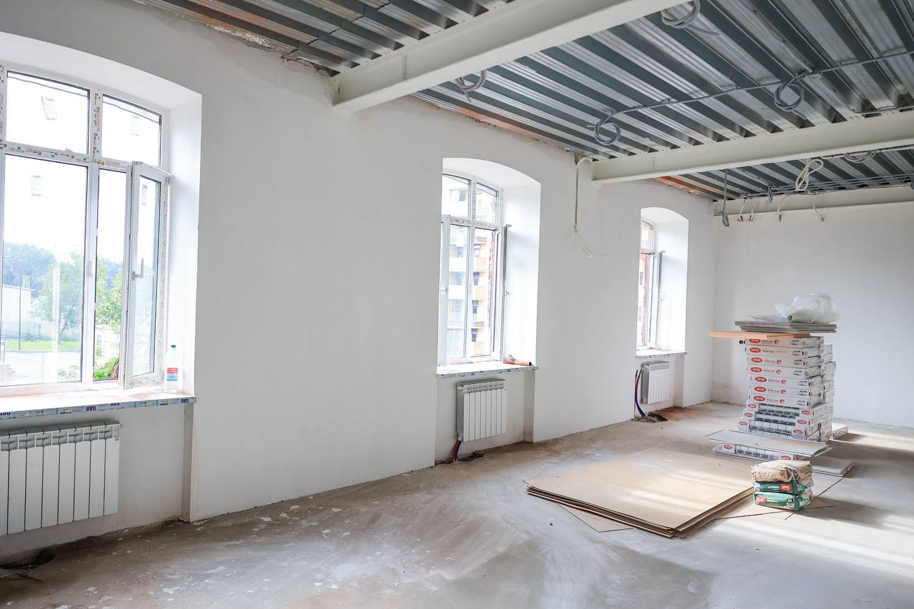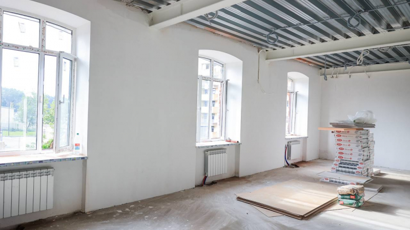 - Ведется покраска фасада. Внутри здания проводятся чистовая отделка, покраска стен и укладка линолеума в кабинетах, устройство напольной плитки в коридорах и санузлах. Завезено оборудование для пищеблока. Подрядчик приступает к пусконаладочным работам.