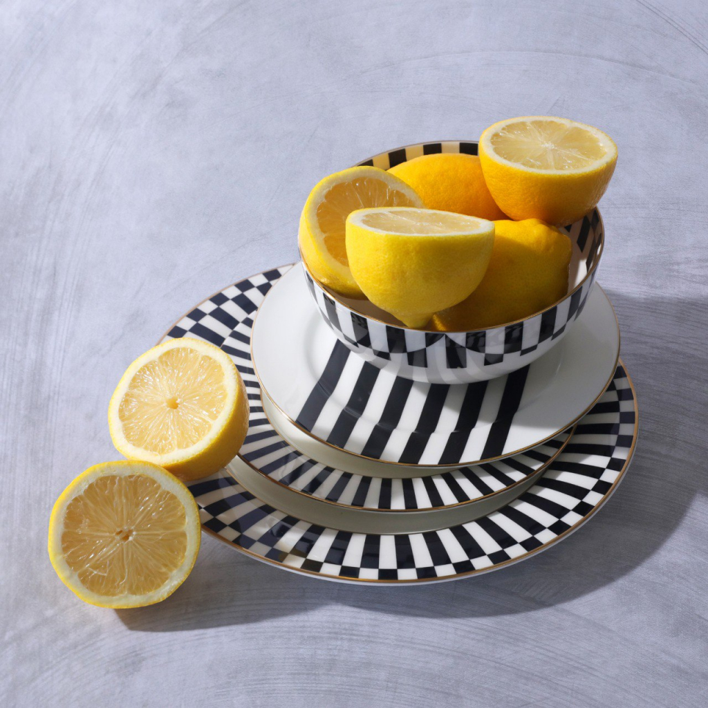 Универсальная гармония чёрного и белого позволяет с лёгкостью выстраивать стильные сервировки, объединяя предметы коллекции с аксессуарами различных оттенков. В коллекции представлены чайные пары и бокалы, миски, суповые, обеденные и десертные тарелки. Каждое изделие – образец изящества, выполненный из костяного фарфора с тонкими штрихами надглазурного декора и элегантными акцентами глянцевого золота.