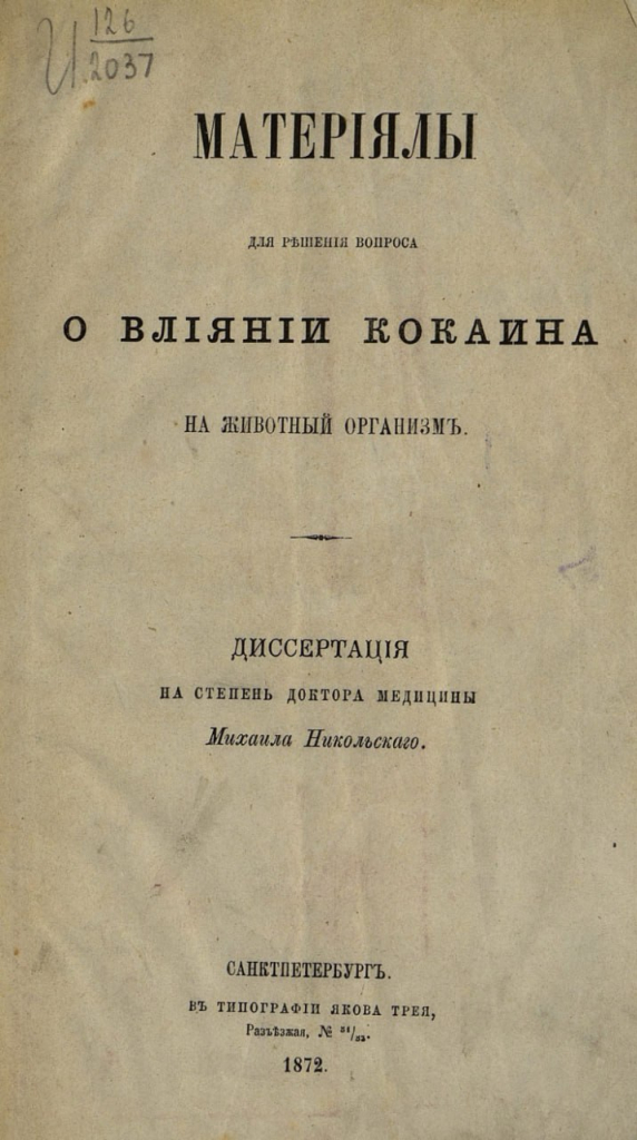 В 1872 году, изучая свойства и влияние на животный организм кокаина, врач Михаил Никольский в своей диссертации писал, что данный препарат используется для лечения хореи, ипохондрии, истерики, меланхолии, конвульсий. Чуть позже начнется применение этого вещества для местного обезболивания в стоматологической и офтальмологической практике.