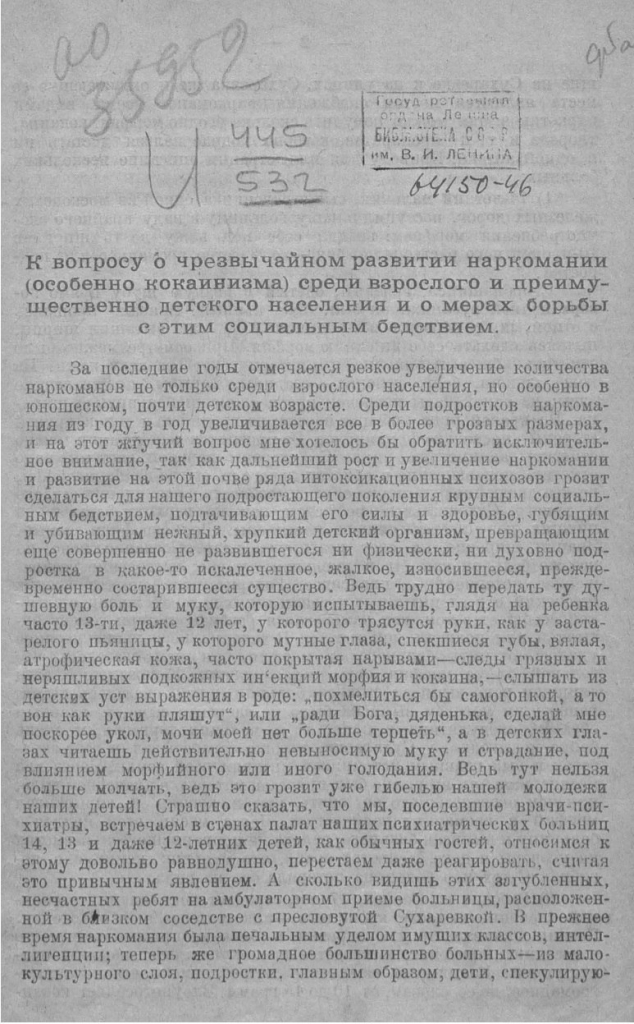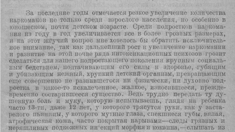 «За последние годы отмечается резкое увеличение количества наркоманов не только среди взрослого населения, но особенно в юношеском, почти детском возрасте. В прежнее время наркомания была печальным уделом имущих классов, интеллигенции; теперь же громадное большинство больных – из малокультурного слоя, подростки, главным образом, дети, спекулирующие на Сухаревке (столичный рынок периода Гражданской войны и НЭПа) и на улицах»,