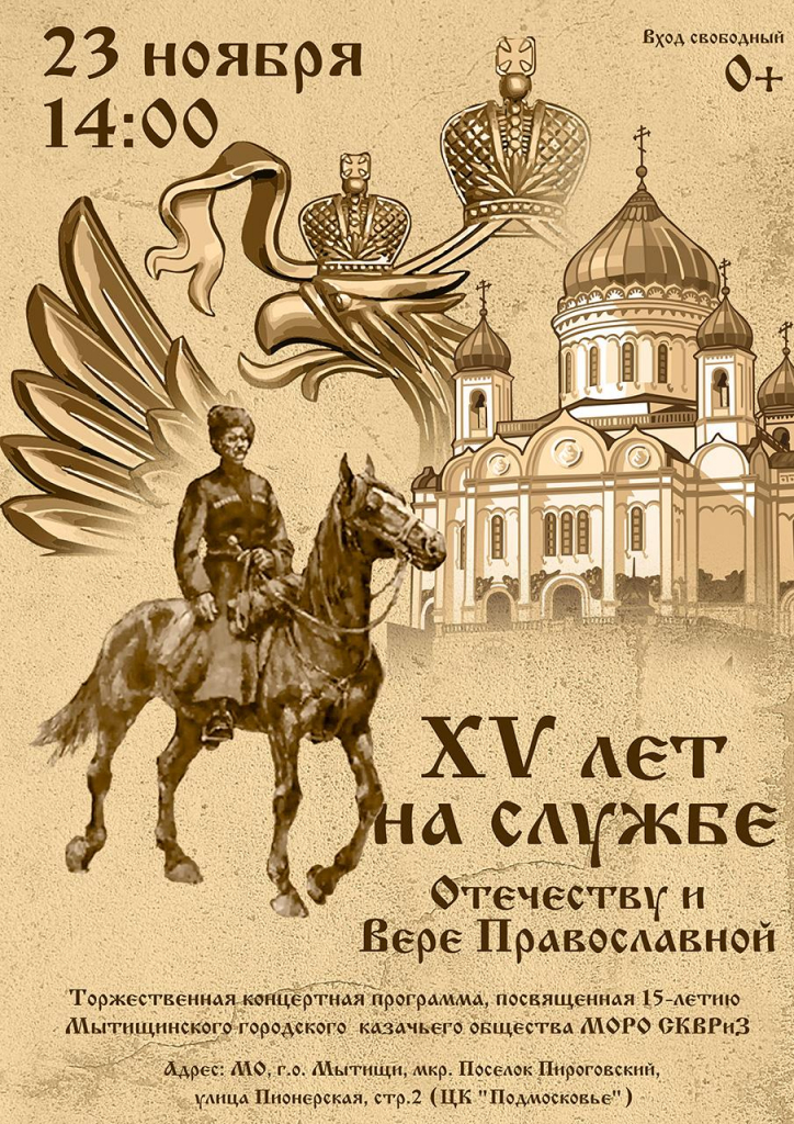 В Центре культуры «Подмосковье» 23 ноября состоится концерт, посвященный 15-летию Мытищинского городского казачьего общества.