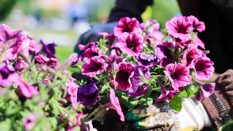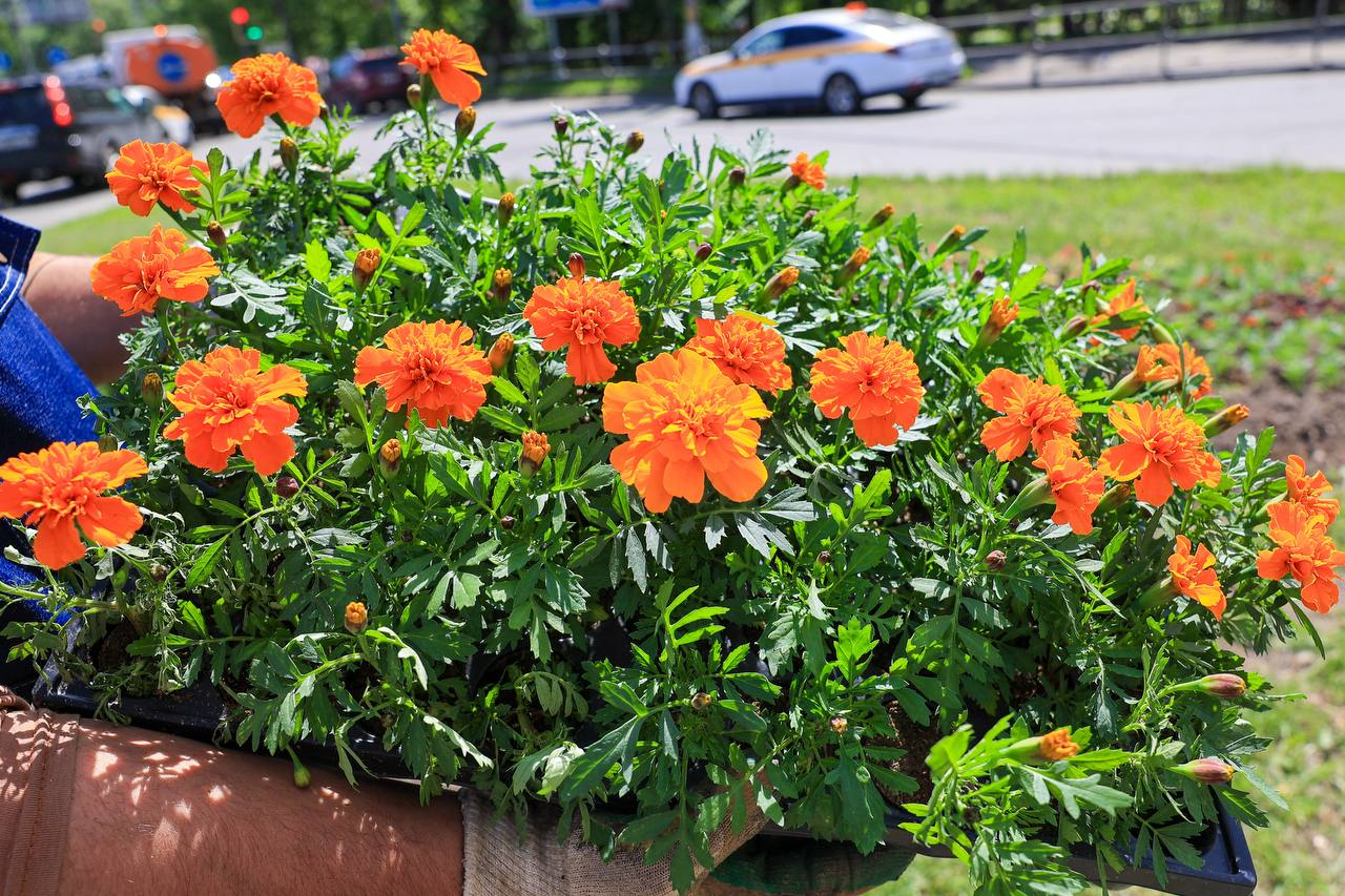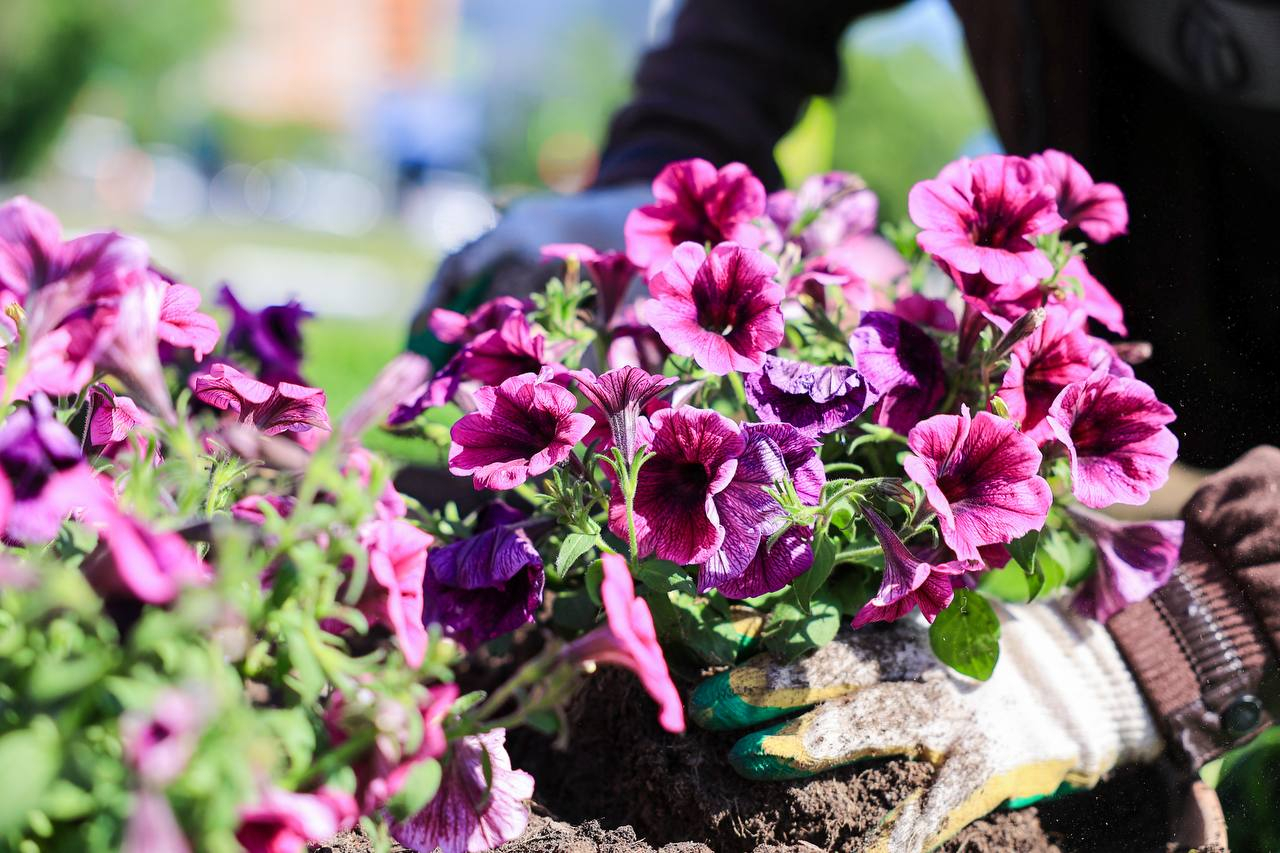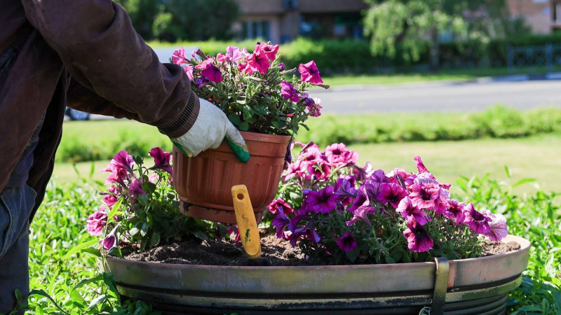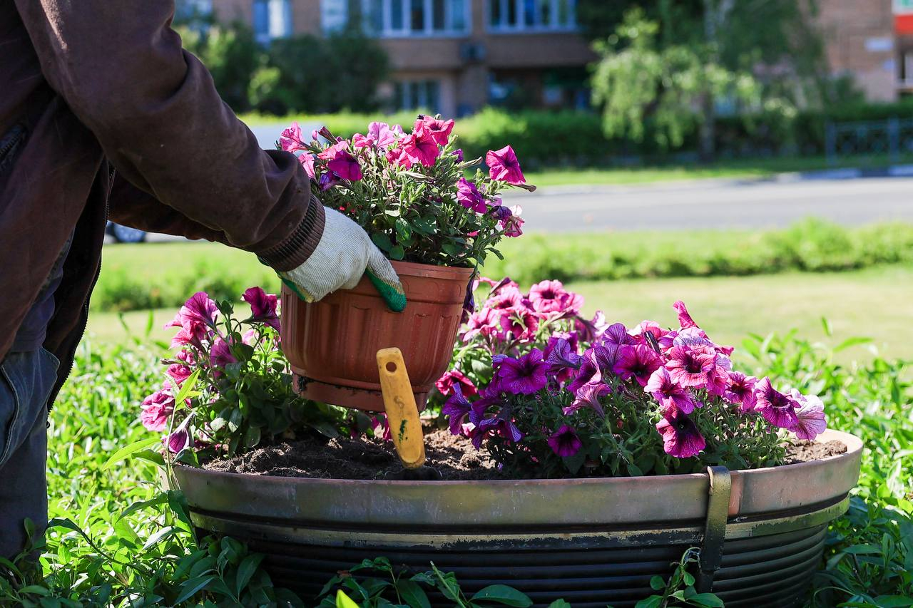 В апреле и мае глаз жителей и гостей округа радовали яркие тюльпаны. Сейчас наступило время их заменить — началась активная высадка летних цветов.