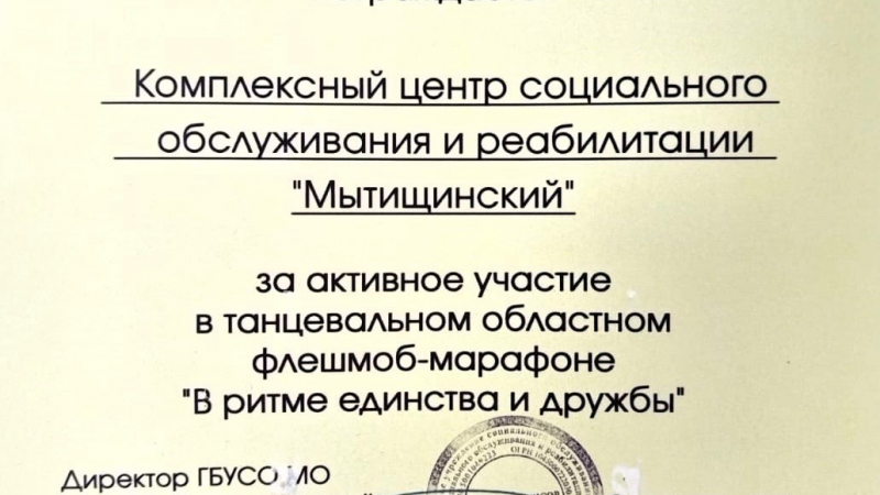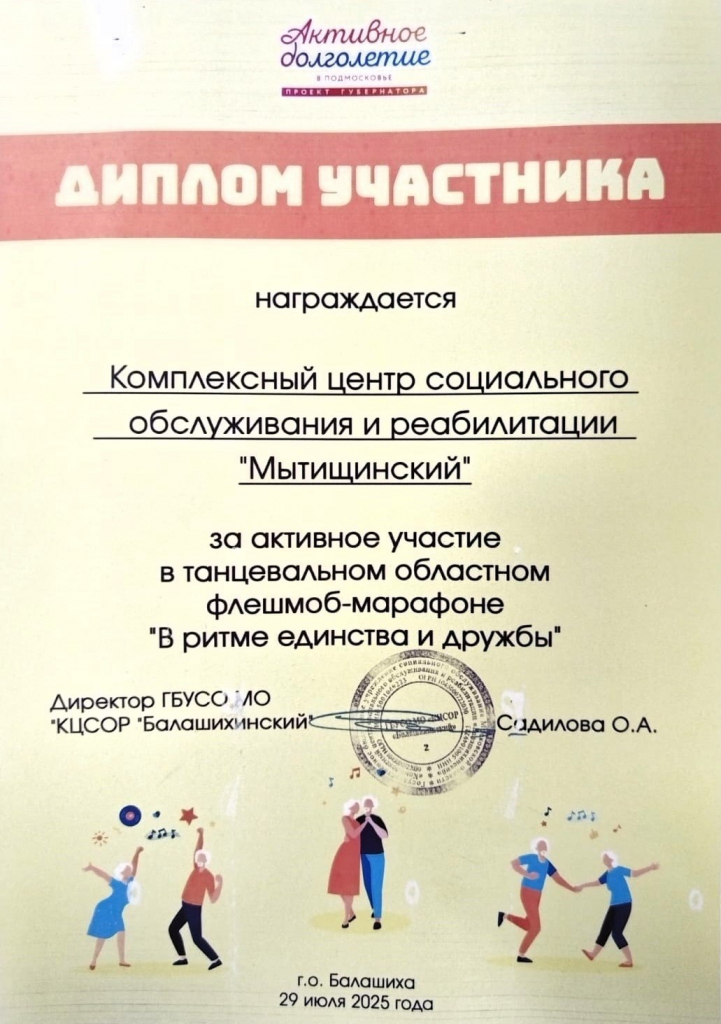 В рамках проекта «Активное долголетие» в Балашихе прошел настоящий праздник движения и позитива – флешмоб-марафон «В ритме единства и дружбы», участниками которого стали и получатели социальных услуг отделения «Активное долголетие» Комплексного центра социального обслуживания и реабилитации «Мытищинский».