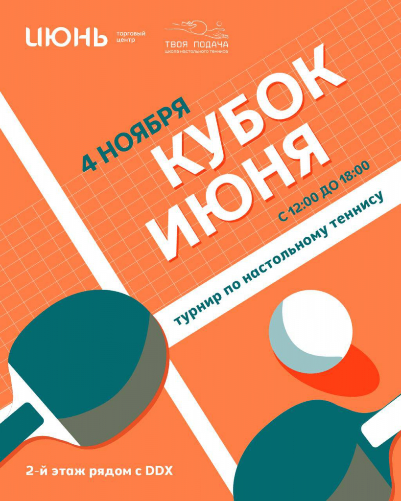 Тогда приготовьте свои ракетки! ТРЦ «ИЮНЬ» совместно со школой настольного тенниса «Твоя подача» приглашает всех желающих принять участие в захватывающем турнире – «Кубок Июня»!