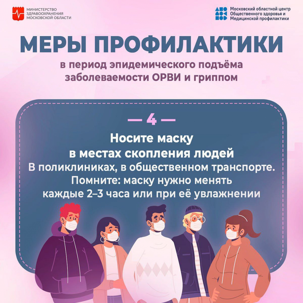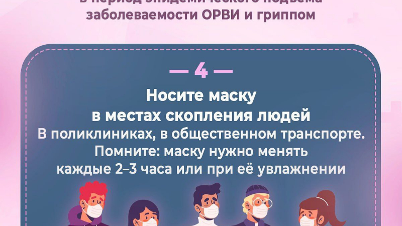 Средства индивидуальной защиты: Используйте маски в поликлиниках и общественном транспорте. Меняйте маску каждые 2-3 часа или при ее увлажнении.