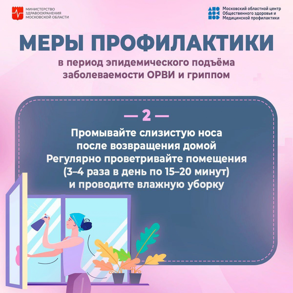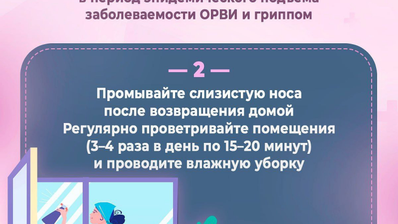 -Проветривание помещений: Регулярно проветривайте помещение 3-4 раза в день по 15-20 минут. Это помогает снизить концентрацию вирусов в воздухе.