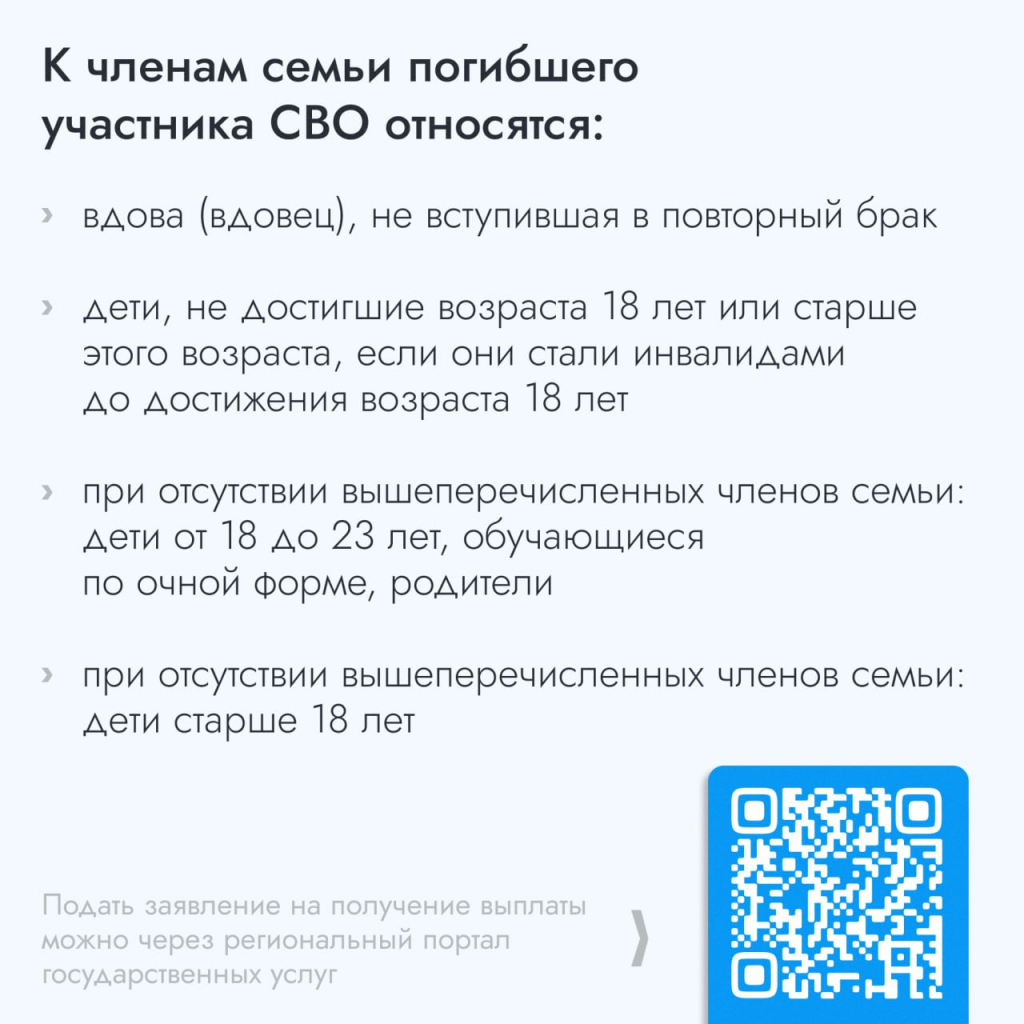 Закон о предоставлении выплаты был принят в конце прошлого года. Её могут получить участники СВО, удостоенные звания Героя РФ или награждённые орденами РФ за заслуги, проявленные в ходе участия в спецоперации, и являющиеся ветеранами боевых действий. А также члены семьи погибшего участника СВО.