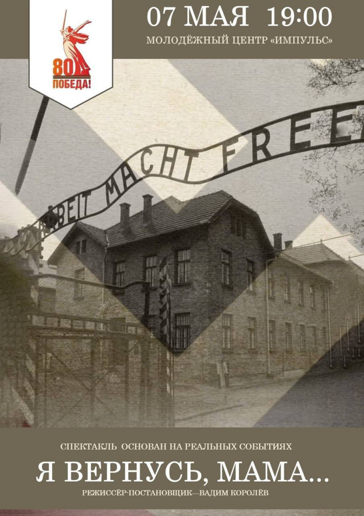 Театральная студия «Окно» представит спектакль «Я вернусь, мама» в молодежном центре «Импульс» 7 мая в 19:00. Сюжет основан на воспоминаниях мытищинских жителей – бывших несовершеннолетних узников фашистских концентрационных лагерей.