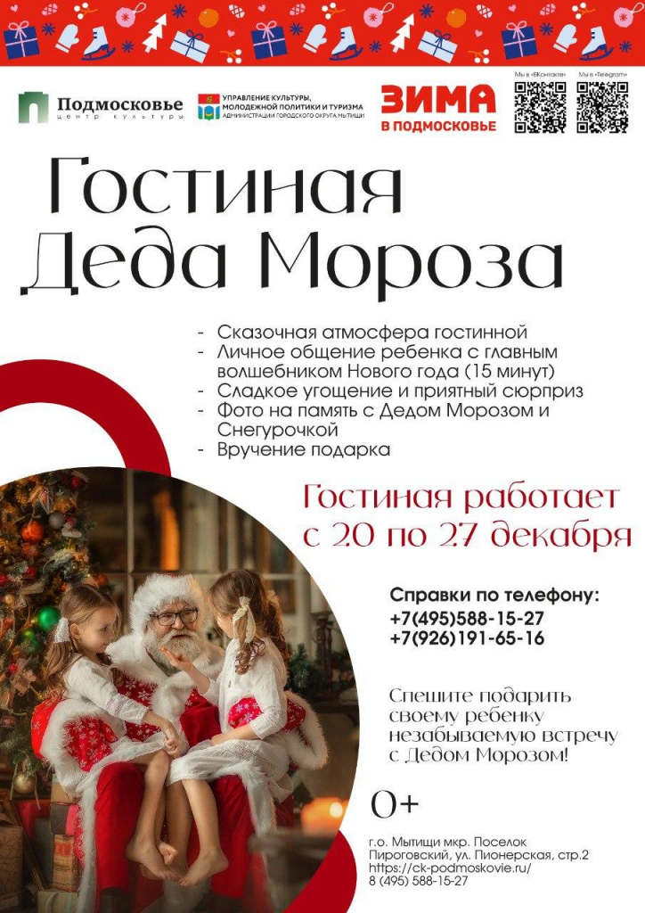 Записаться на встречу и задать вопросы можно по телефону: 8 (926) 191-65-16; 8 (495) 588-15-27 (канцелярия Деда Мороза), ЦК «Подмосковье», мкр. Пироговский, ул. Пионерская, 2.