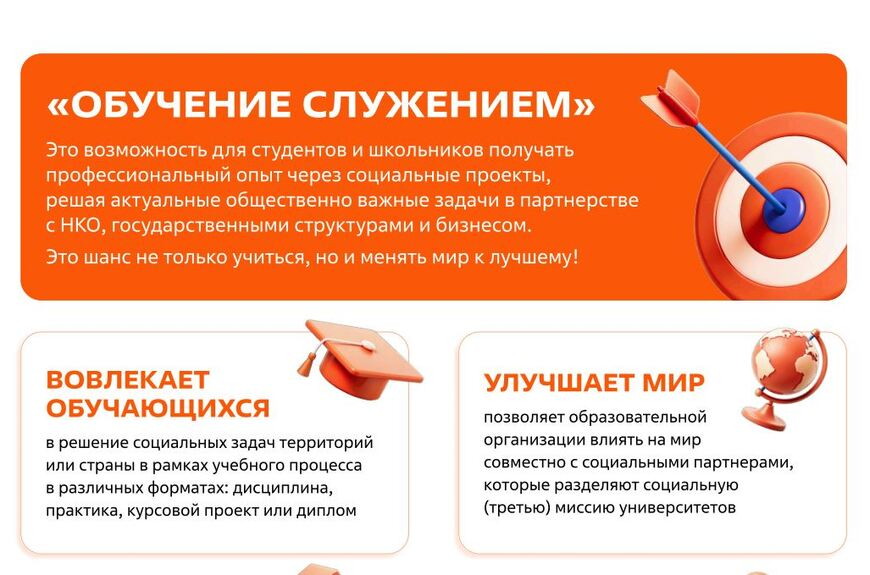 Программа "Обучение служением" приглашает студентов и школьников принять участие в различных социальных проектах, и, решая актуальные для общества задачи, обрести профессиональный опыт, который станет ступенькой к делу жизни.