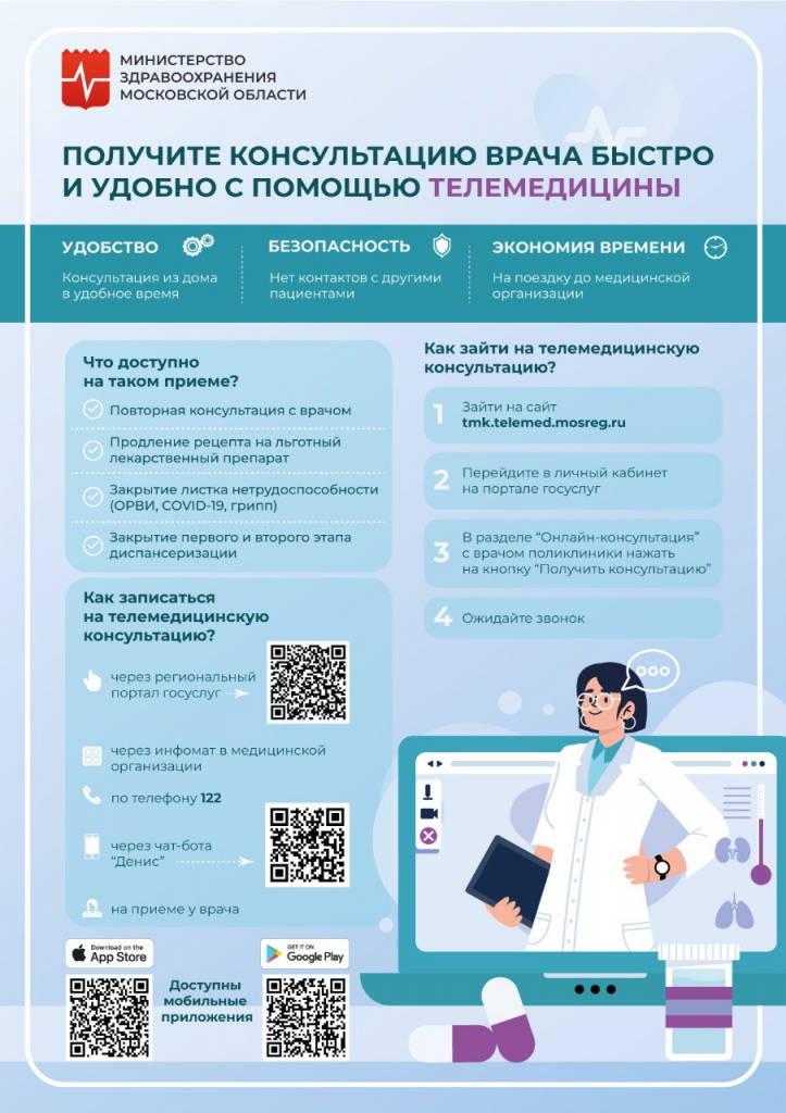 Жители Мытищинского городского округа могут воспользоваться услугами телемедицины. Для того, чтобы воспользоваться услугой, необходимо записаться на первичную консультацию через приложение «РТ ДокторОнлайн».