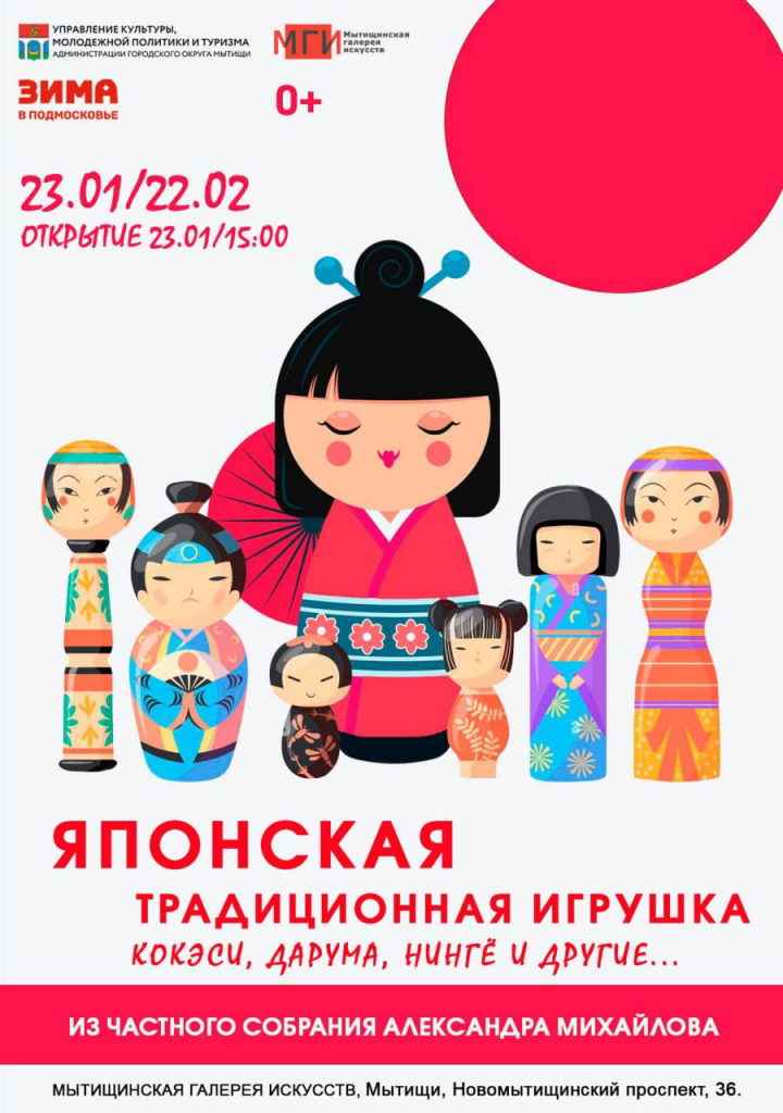 Экспозиция под названием «Японская традиционная игрушка. Кокэси, Дарума, Нингё и другие», представленная коллекционером Александром Михайловым, познакомит зрителей с направлением японского прикладного искусства – искусством создания кукол и игрушек.