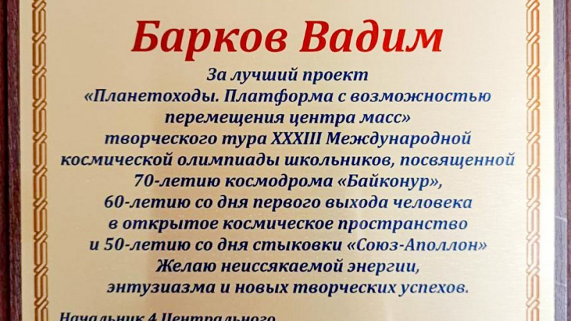 Мытищинские ребята, ученики школы № 6, привезли сразу две награды – девятиклассник Тимур Алиев стал призером в программе «Физика», а одиннадцатиклассник Вадим Барков со своим проектом «Планетоходы. Платформа с возможностью перемещения центра масс» победил в творческом туре!