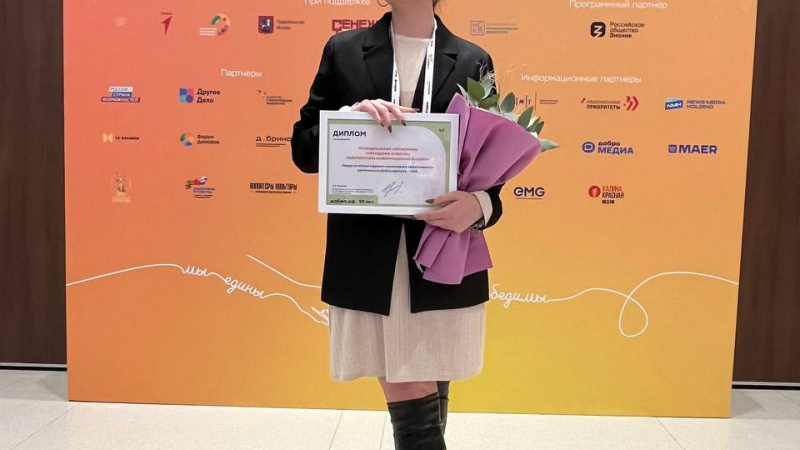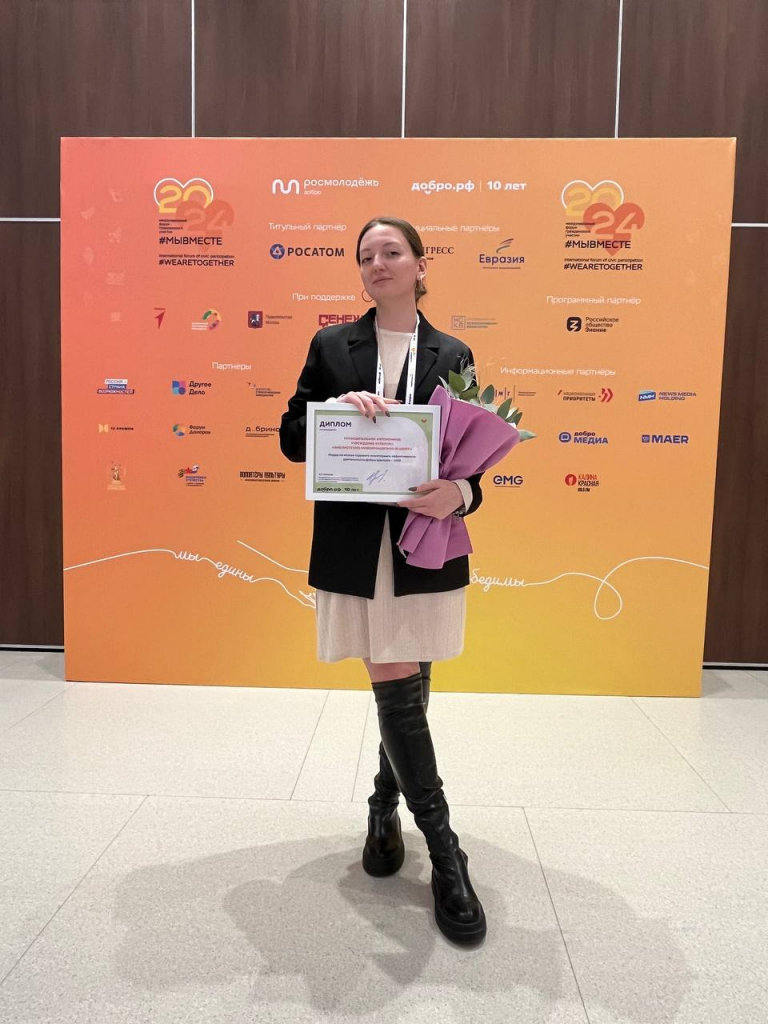 Исполнительный директор Ассоциации Добро.рф Кирилл Антонов вручил заслуженную награду руководителю Добро.Центра из Мытищ Ксении Карасевой.
