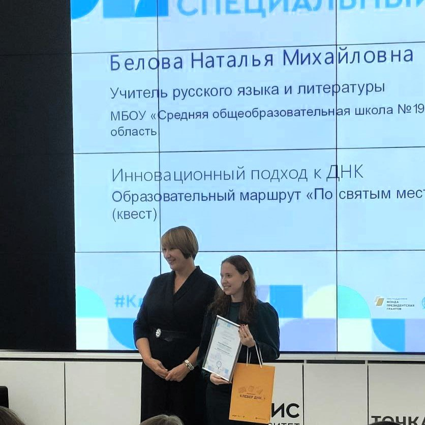 Среди награжденных – учитель русского языка и литературы из мытищинской школы № 19 Наталья Белова. Разработанный ею красочно иллюстрированный сборник заданий для образовательного квеста по православным местам получил специальный приз жюри в номинации «Инновационный подход к ДНК», подноминация: «Образовательный маршрут «По святым местам» (квест)».