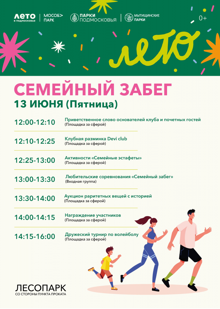 13 июня в Мытищинском лесопарке пройдет спортивное мероприятие «Семейный забег». Зарядка, семейные эстафеты, забег, аукцион и многое другое ждёт вас!