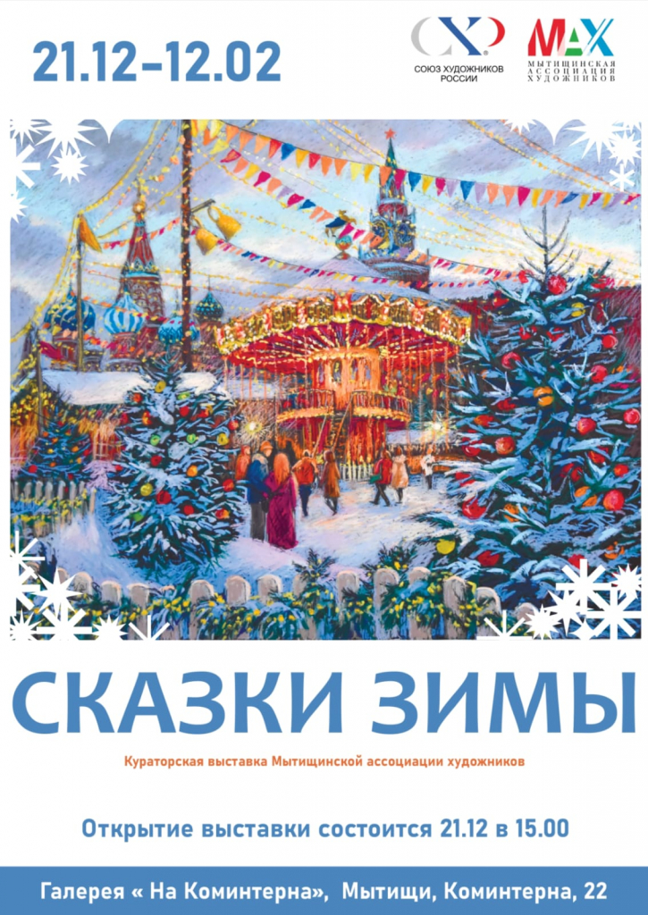 21 декабря в 15:00 состоится открытие кураторской выставки Мытищинской ассоциации художников «Сказки зимы». Свои работы представят Марина Любимова, Анна Петренко, Ольга Ионайтис, Сергей Чертов, Олеся Осипова, Алексей Волошин, Владимир Пермиловский, Ольга Ковальчук, Екатерина Фищук и другие авторы.