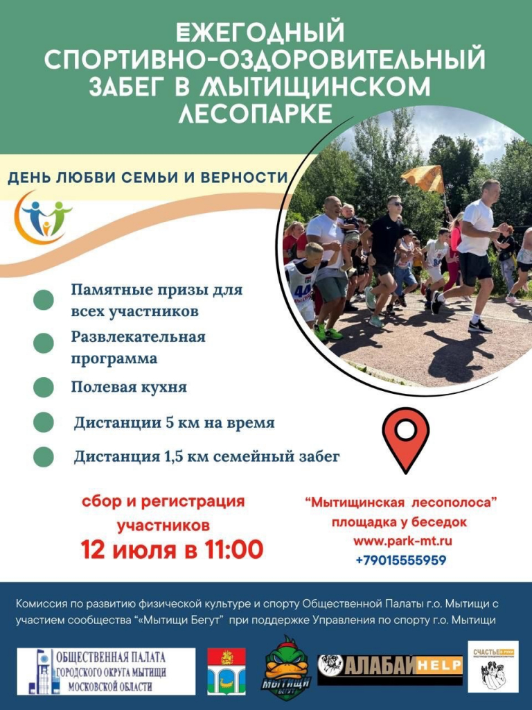 В Мытищинском лесопарке пройдет ежегодный спортивно-оздоровительный забег, организованный комиссией по физической культуре и спорту окружной Общественной палаты с участием сообщества «Мытищи Бегут» при поддержке администрации округа. Забег будет посвящен Дню семьи, любви и верности.