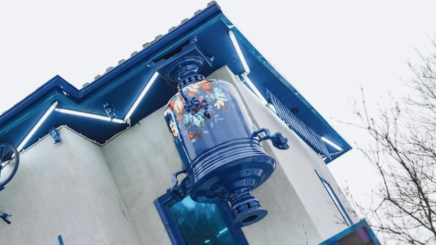 В парке Мира в Мытищах новый арт-объект отражает культурный код региона — жостовский народный промысел. Фасад «Перевернутого дома» оформлен в пиксельном стиле с элементами жостовской росписи. Такое архитектурное решение связывает воедино современность с исторической идентичностью.