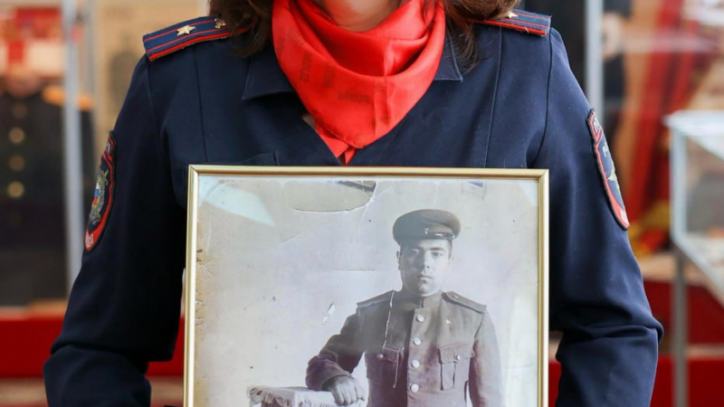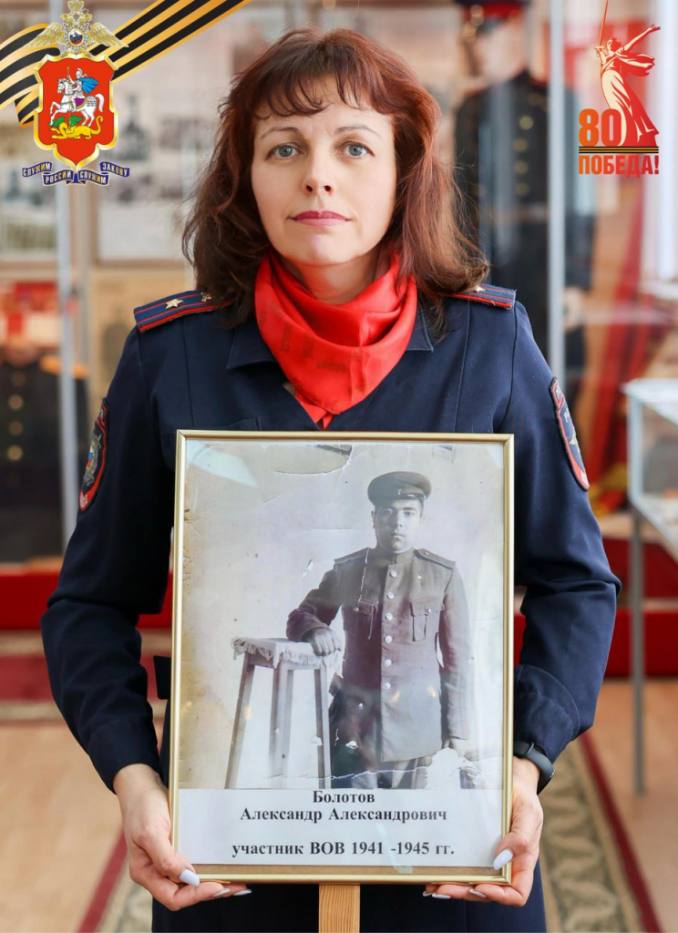 Инспектор группы кадров ОРЛС МУ МВД России «Мытищинское» майор полиции Наталья Шевчугова с фотографией своего дедушки Александра Александровича Болотова.