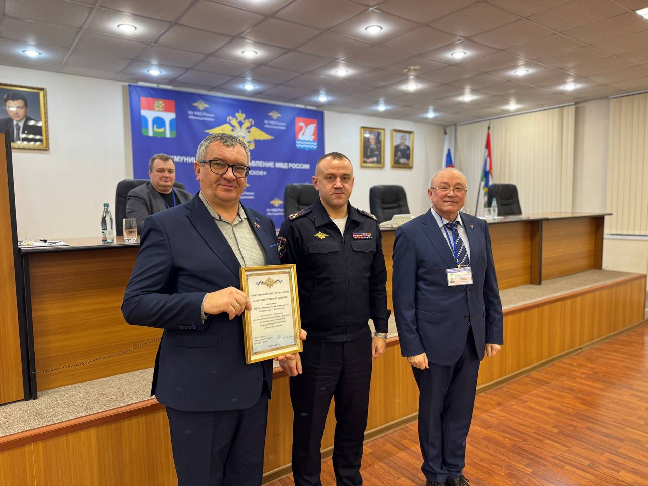 Начальник МУ МВД России «Мытищинское» полковник полиции Николай Жуков на заседании Общественного совета вручил благодарственное письмо от председателя Общественного совета при МВД России Анатолия Кучерены коллективу МБУК «Мытищинский театр кукол «Огниво» им. С. Железкина» за оказанное содействие при подготовке видеороликов в формате кукольных мини-спектаклей профилактического проекта «Объясняем, играя».