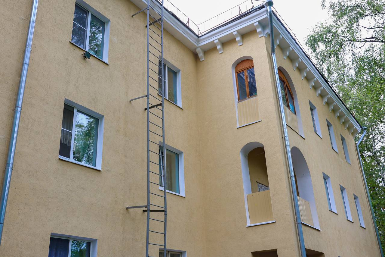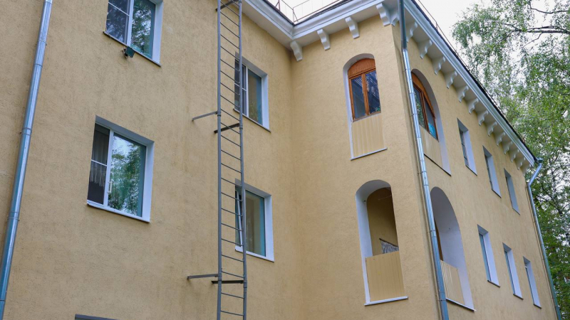 Подрядная организация проводит ремонт кирпичного фасада. По просьбе жителей был максимально сохранен исторический облик фасада, а все колористические решения согласованы с советом дома. Дополнительно рабочие обшили экраны балконов и заменили козырек над объездом.