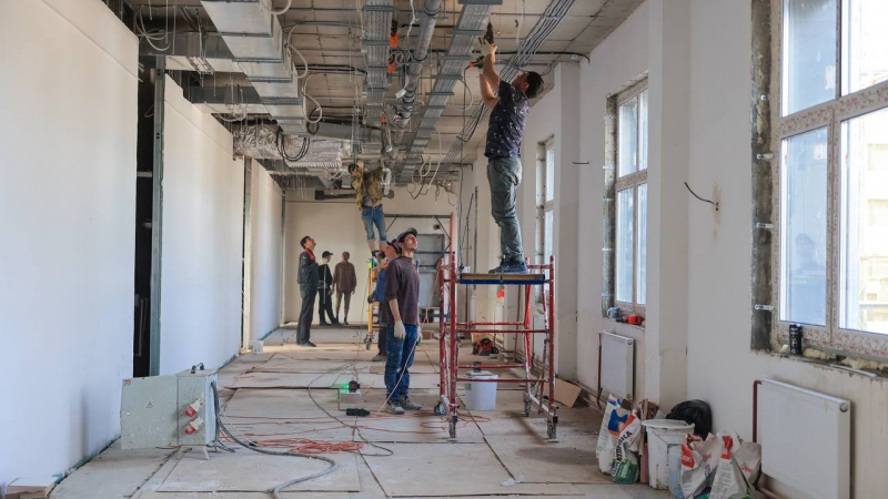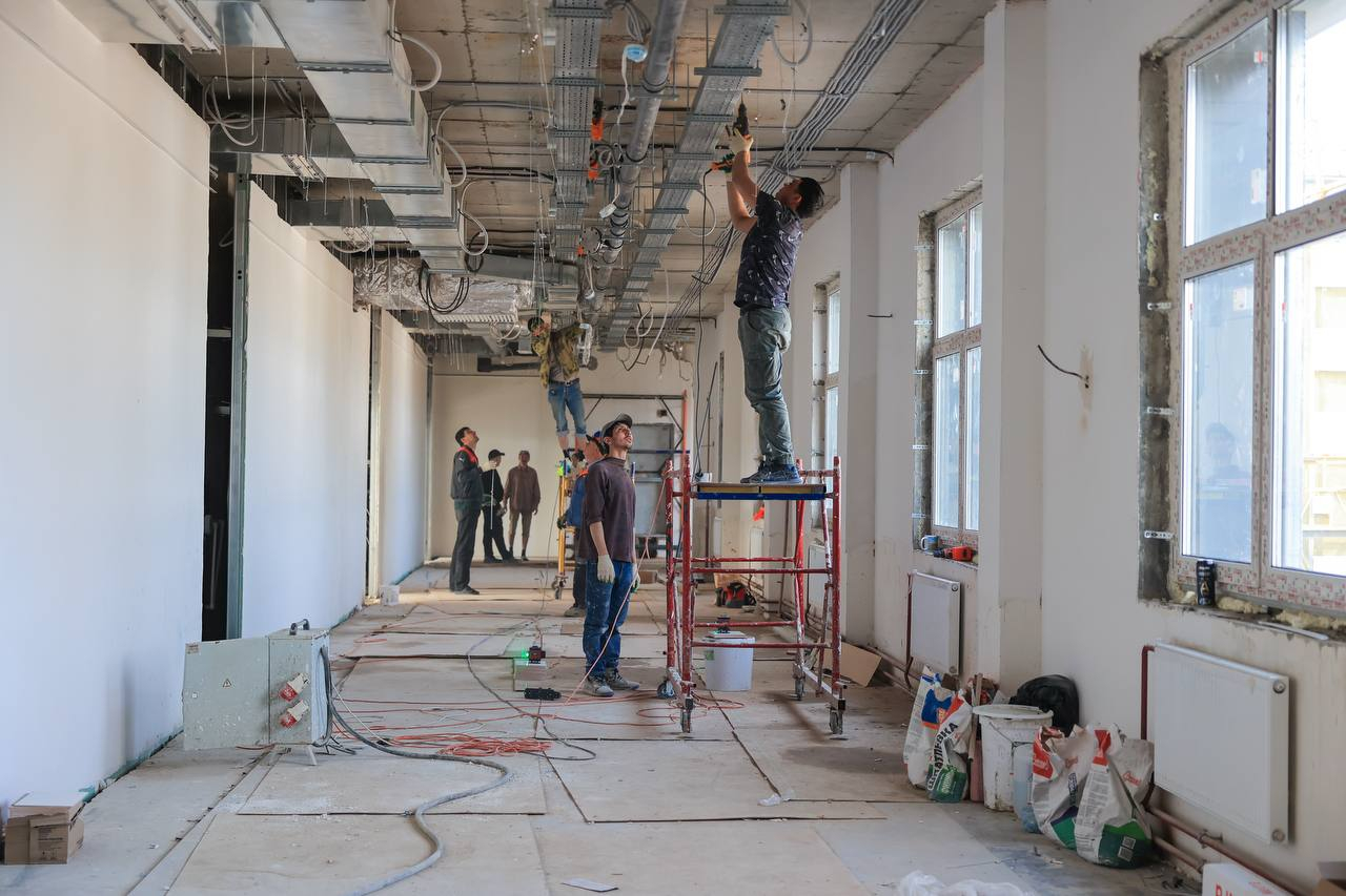 На сегодняшний день ведутся работы по внутренней отделке помещений и слаботочным системам, укладке напольного покрытия, а также плиточные работы в пищеблоке, начат монтаж потолков.