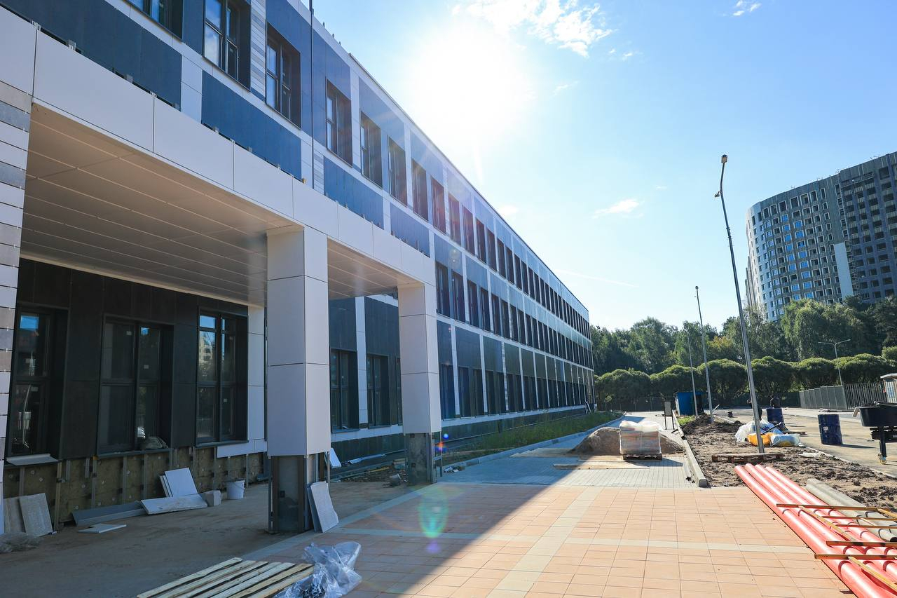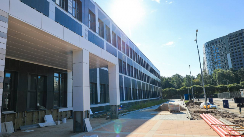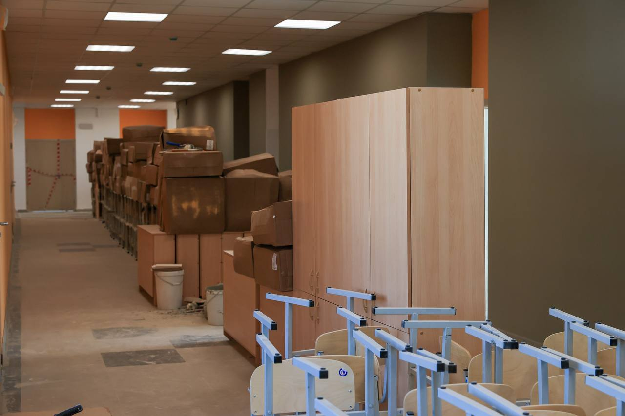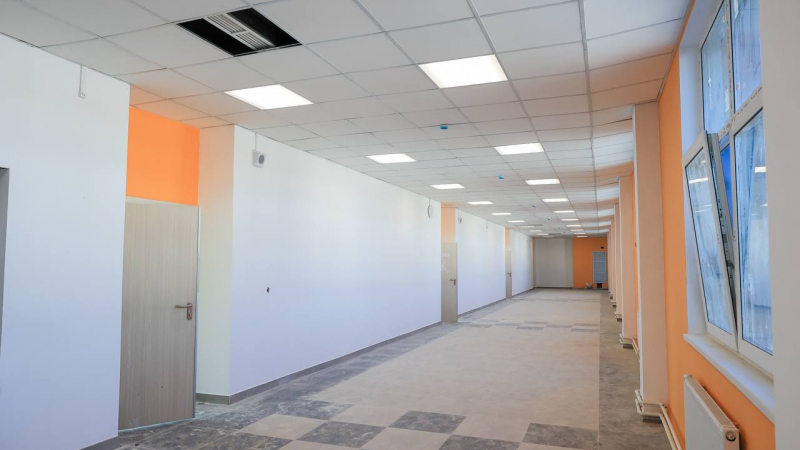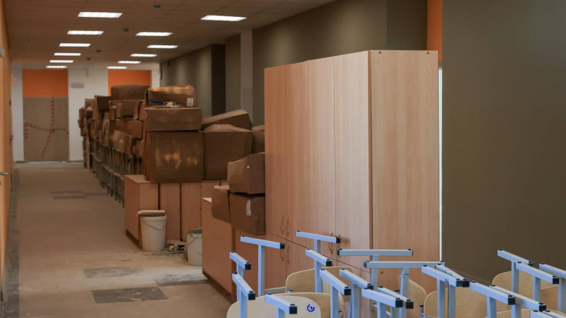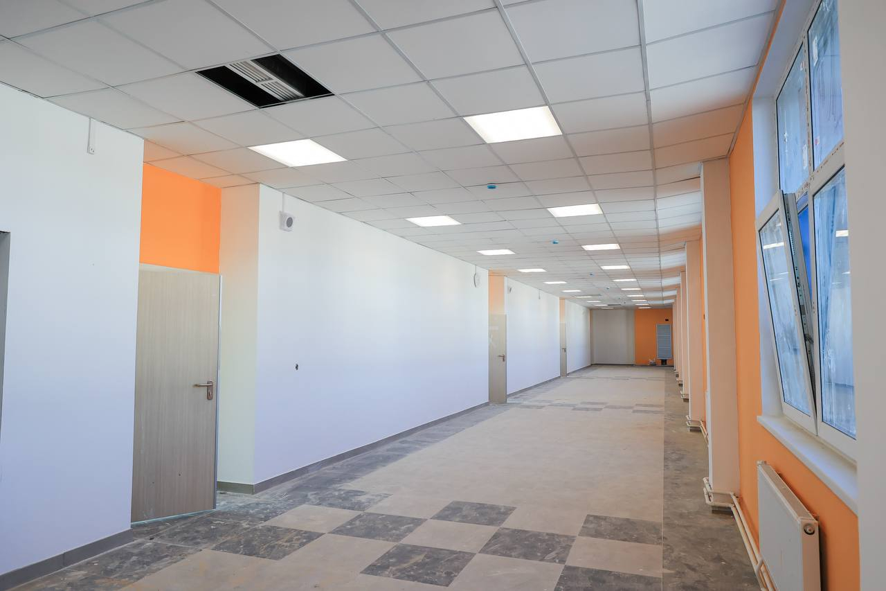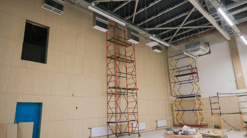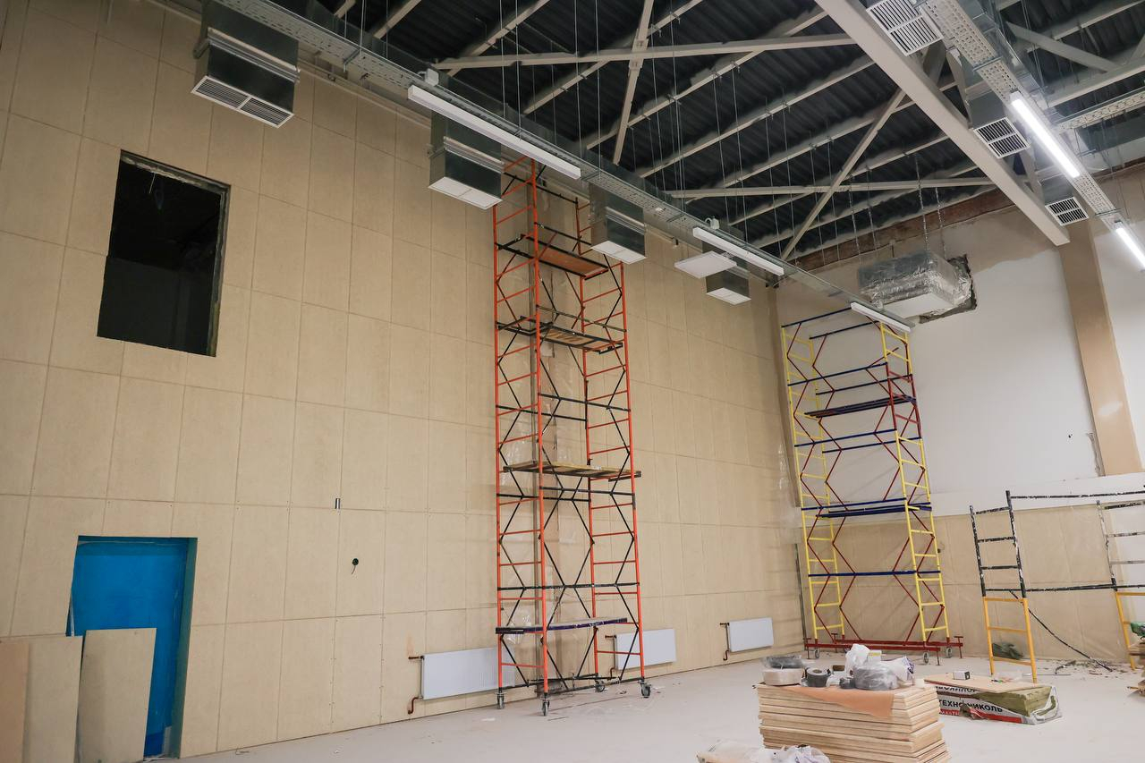 На сегодняшний день на объекте проводятся чистовая отделка, сборка и расстановка мебели. В актовом зале монтируются акустические панели. Продолжается установка дверей и укладка напольной плитки на лестницах.