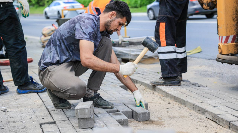 Напротив дома № 20 подрядная организация проводит обновление брусчатки на пешеходном тротуаре.