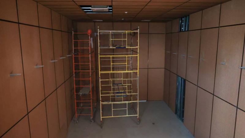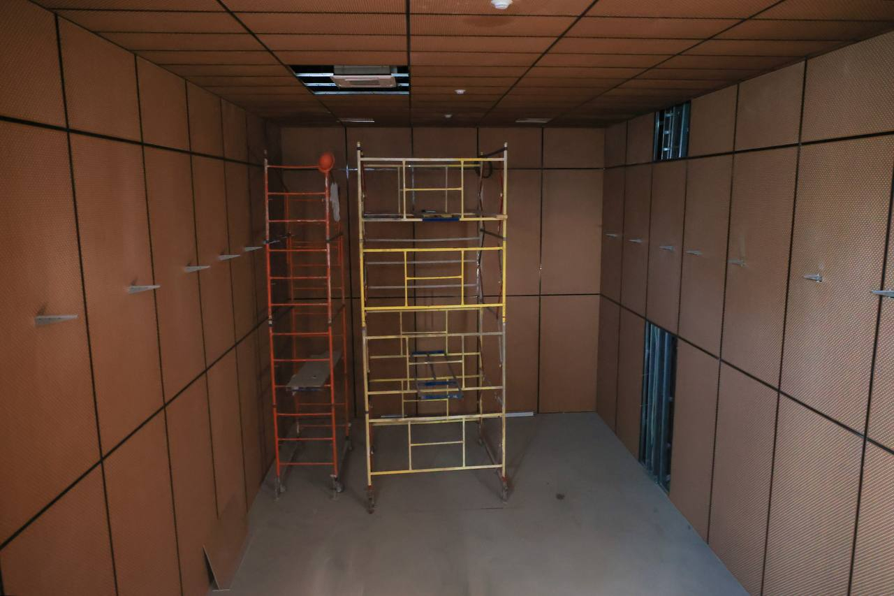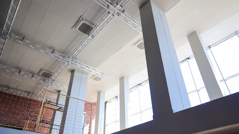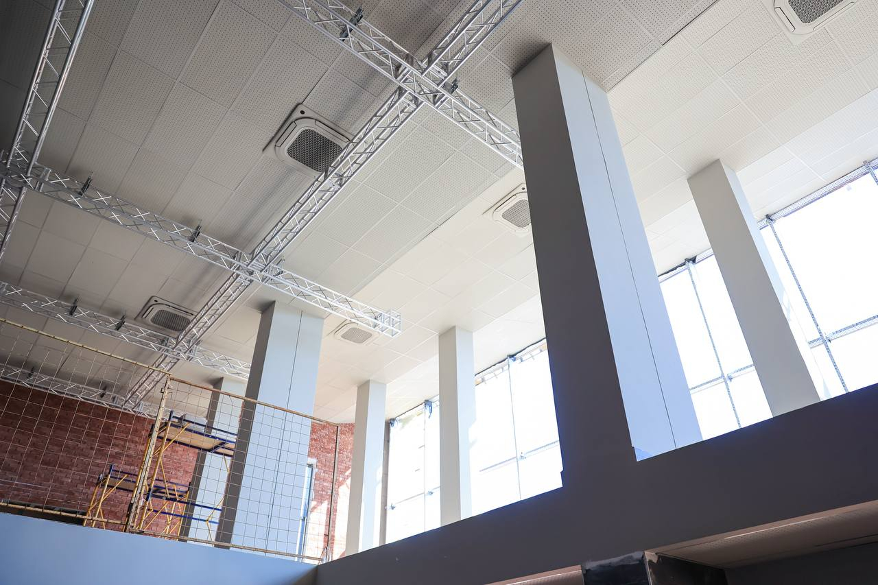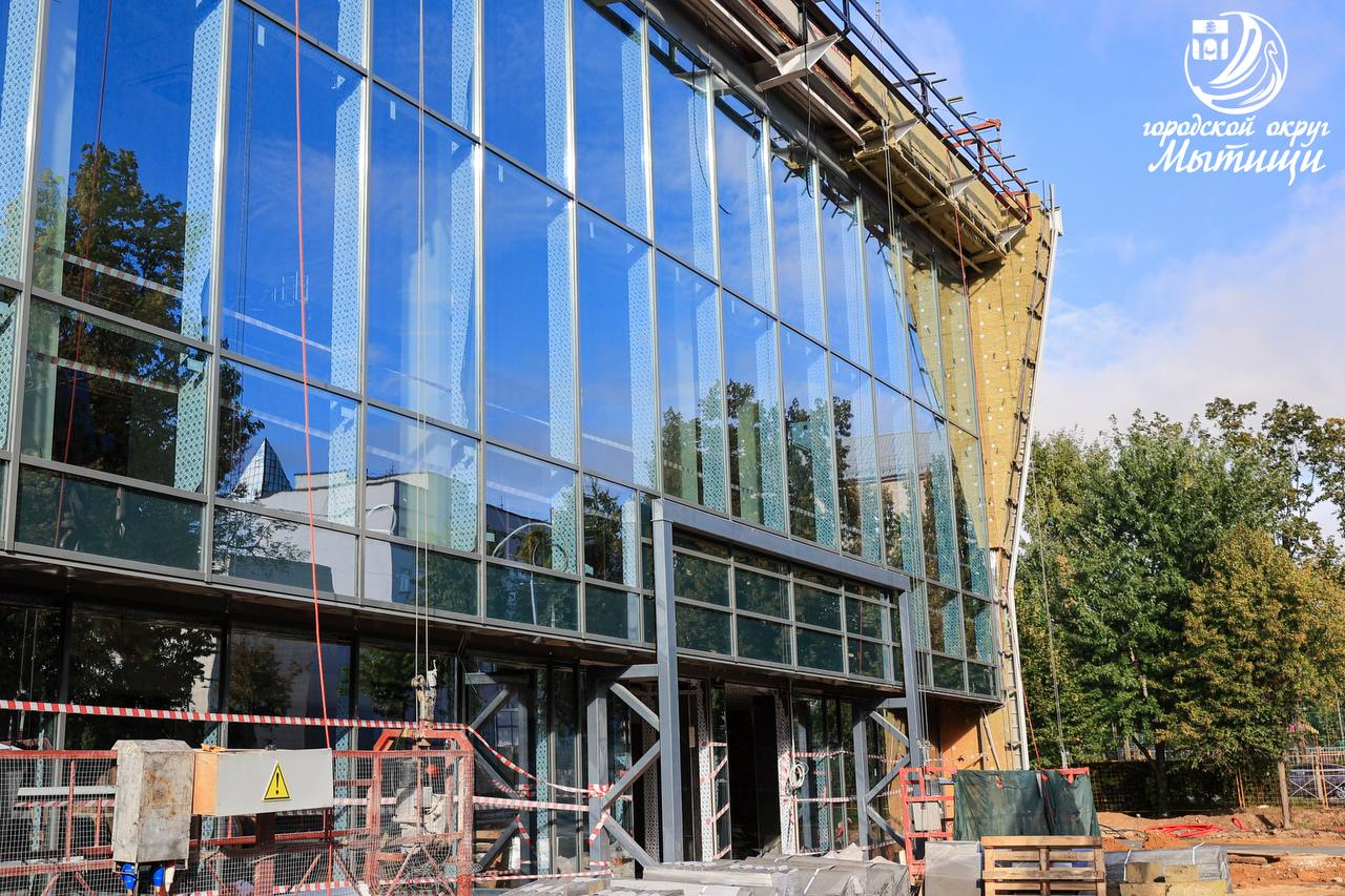 На сегодняшний день выполнена отделка административного блока, ведутся покраска стен в остальных помещениях и установка дверей. В фойе здания проводится остекление, а залах – монтаж мультимедийных панелей.