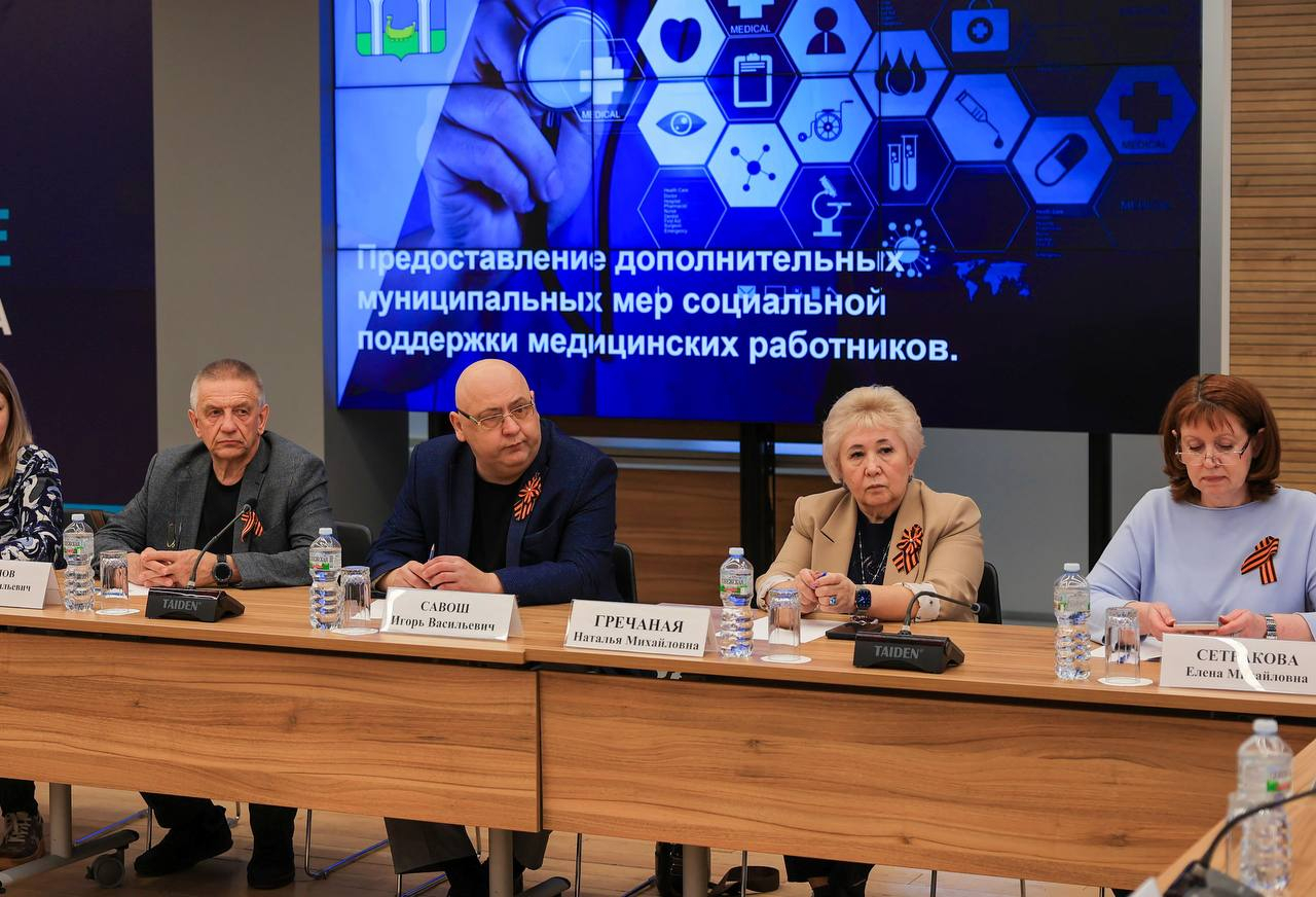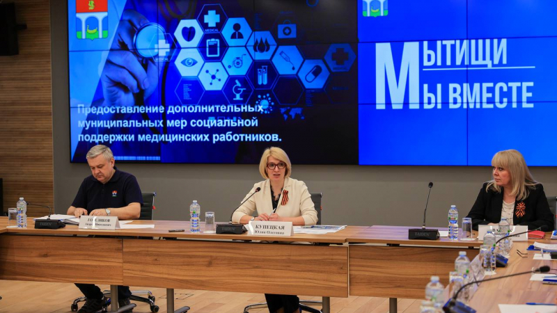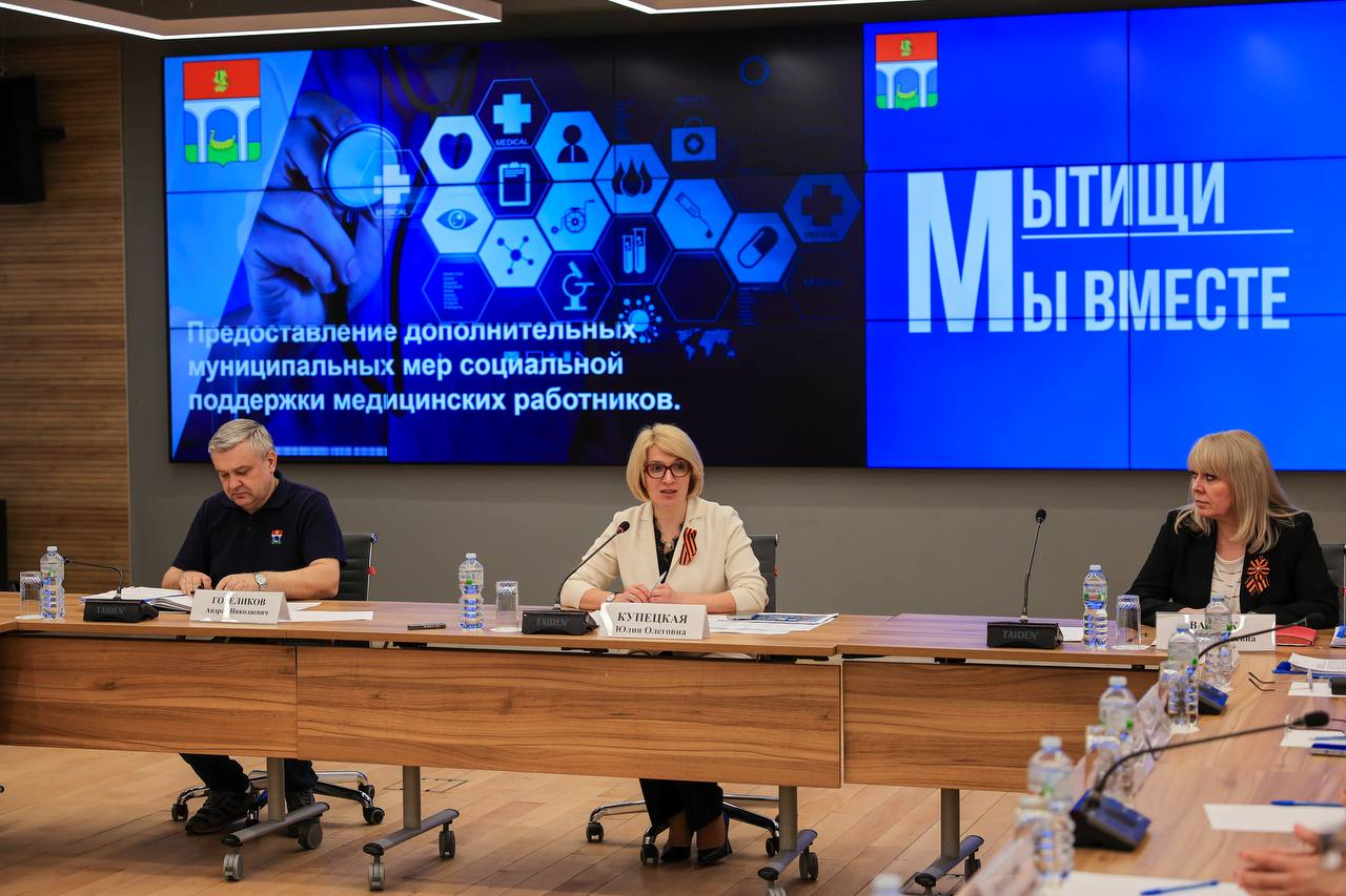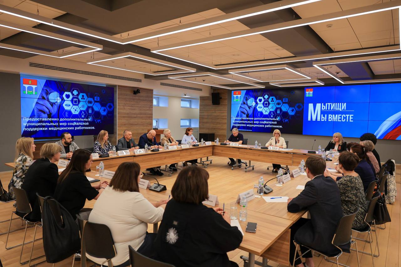 Совместно с главным врачом Мытищинской областной клинической больницы Ольгой Мисюкевич, заведующей Мытищинской подстанцией Московской областной станции скорой медицинской помощи Марией Саввиной, сотрудниками учреждений здравоохранения, представителями депутатского корпуса и Общественной палаты обсудили реализацию муниципальных мер социальной поддержки для медицинских работников государственных учреждений здравоохранения, расположенных на территории городского округа Мытищи.