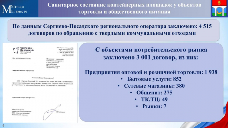 В соответствии с действующим законодательством у каждого хозяйствующего субъекта должен быть заключен договор на вывоз мусора. Сергиево-Посадским региональным оператором с объектами потребительского рынка заключено свыше 3 тыс. договоров по обращению с твердыми коммунальными отходами (ТКО). Объём и расчет отходообразователя рассчитывается по нормативу, исходя из торговой площади объекта.