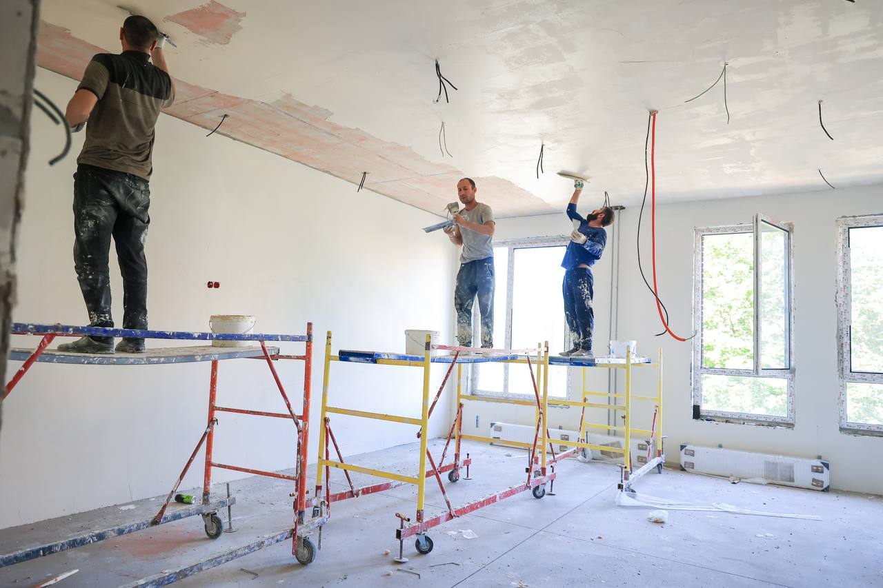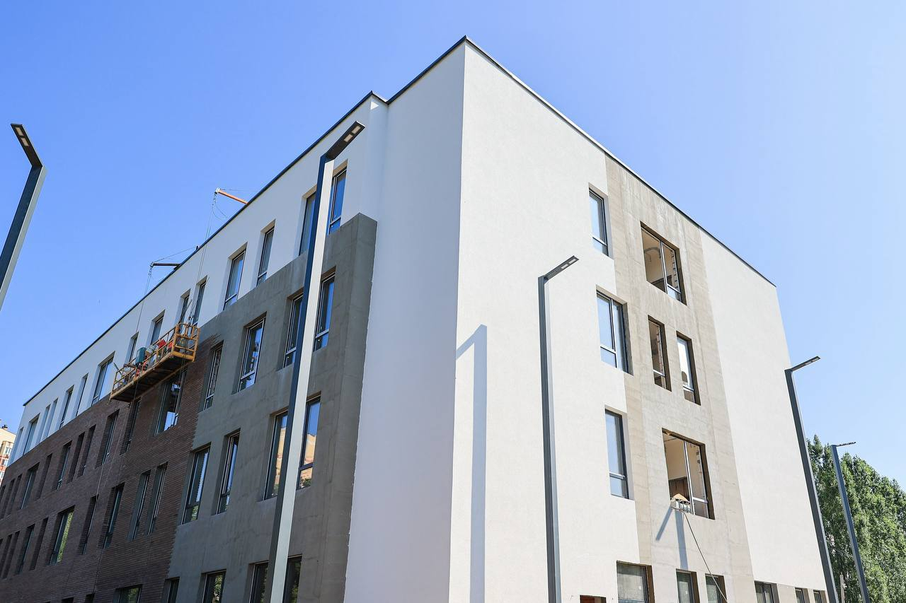 В полном объеме выполнено устройство кровли, на 80% завершены фасадные работы. Внутри здания ведется чистовая отделка, смонтированы электрика и слаботочные системы. Со следующей недели рабочие приступают к отделке пищеблока.