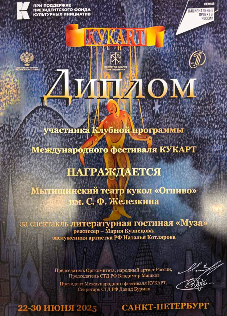 С 22 по 30 июня в Санкт-Петербурге и Выборге состоялся XVII Международный фестиваль-биеннале кукольных и синтетических театров КУКАРТ. В мероприятии приняли участие театральные коллективы со всей России, в их числе – мытищинский театр кукол «Огниво» имени С. Железкина.