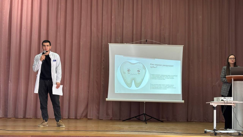 В ходе лекции стоматолог напомнил ребятам, что большое употребление сладостей и сладких газированных напитков способствует образованию налета из сахара и кислот, что является питательной средой для бактерий. Это ускоряет разрушение зубов и способствует развитию кариеса. Ежедневная чистка зубов снижает количество налета и бактерий. Выбирать щетку лучше с мягкой щетиной и малой головкой. Она лучше очищает налет в труднодоступных местах, не повреждая десны. Чистить зубы нужно не менее 2 минут круговыми движениями. Зубная паста с фтором помогает укрепить эмаль зубов, уменьшая чувствительность к бактериям и предотвращая развитие кариеса.