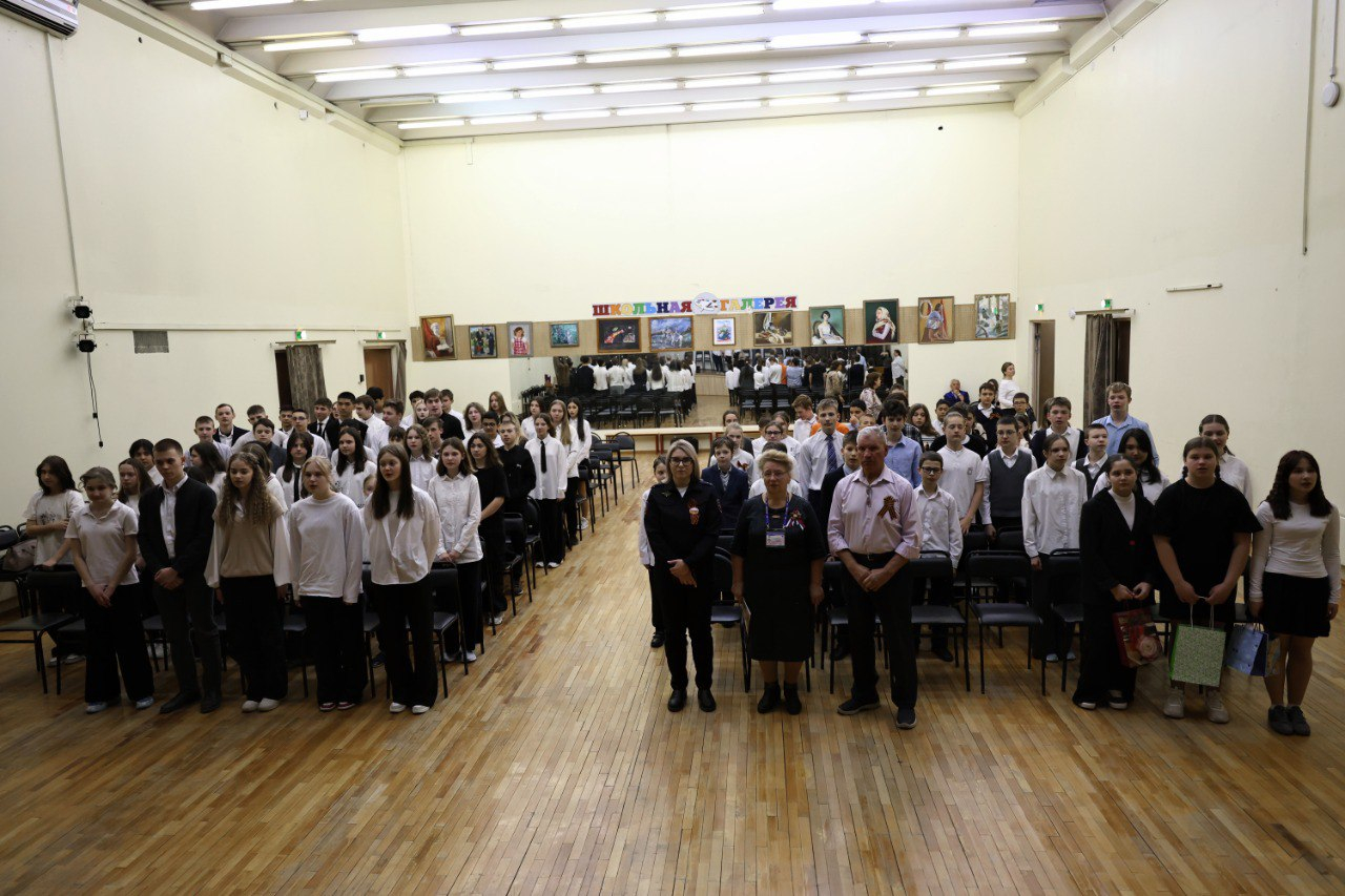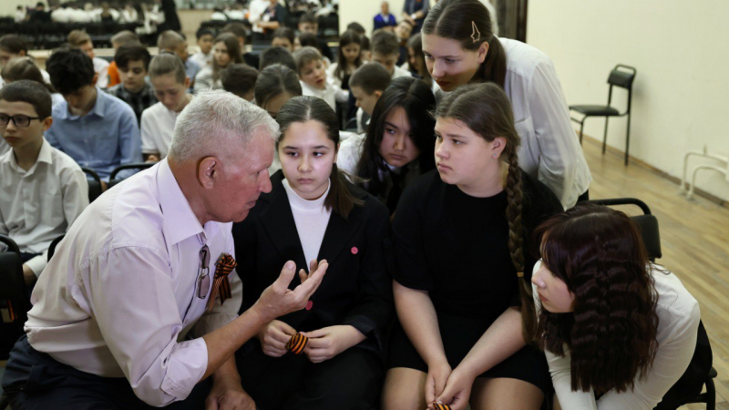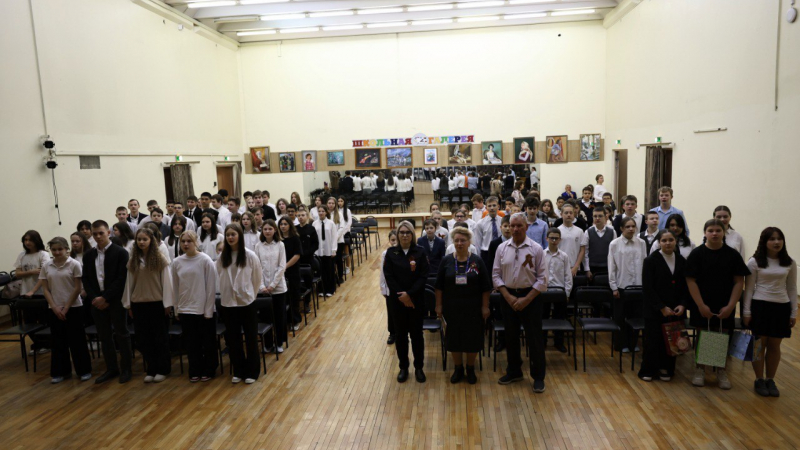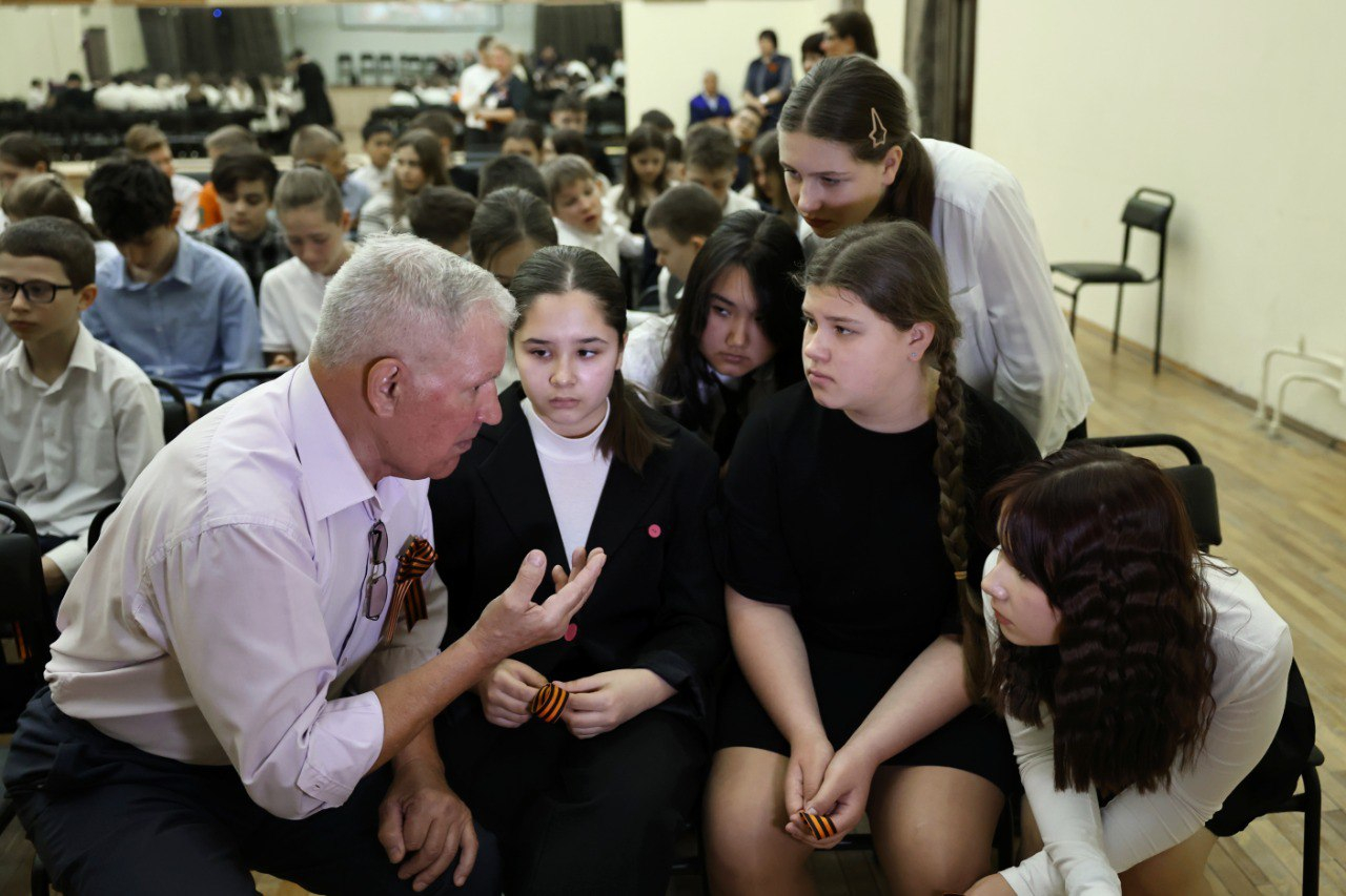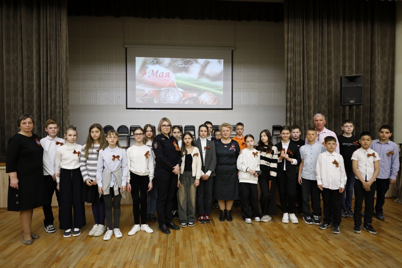 Школьники тоже подготовили свою программу – они вместе пели песни, читали стихи, в завершении урока им вручили георгиевские ленточки.