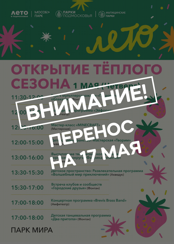 Погода вносит свои коррективы: мероприятие «Открытие тёплого сезона» во всех парках переносится на 17 мая.